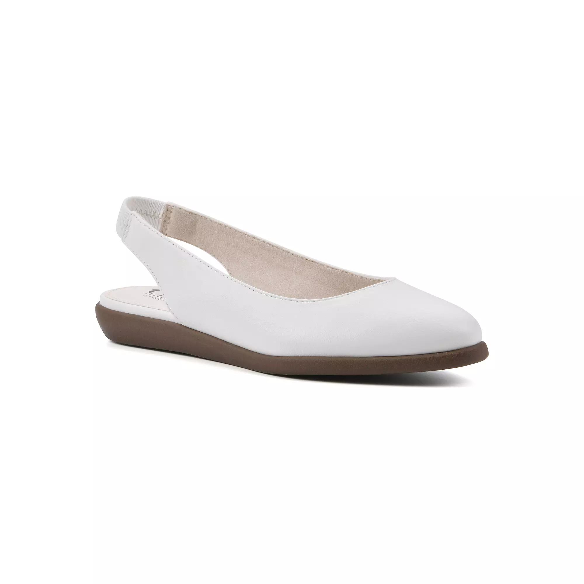 Step into style with these Cliffs by White Mountain Memory women's slingback ballet flats. Click this FOOTWEAR GUIDE to find the perfect fit and more! - https://www.kohls.com/feature/shoesizeguide.jsp. FEATURES: Elastic stretch back strap, Cushioned insole, Flexible outsole. DETAILS: PU upper, Synthetic lining and outsole, Pointed toe, Slip-on, 0.5-in. heel, Spot clean, Imported. Size: 7. Color: White Smo. Gender: female. Age Group: adult.