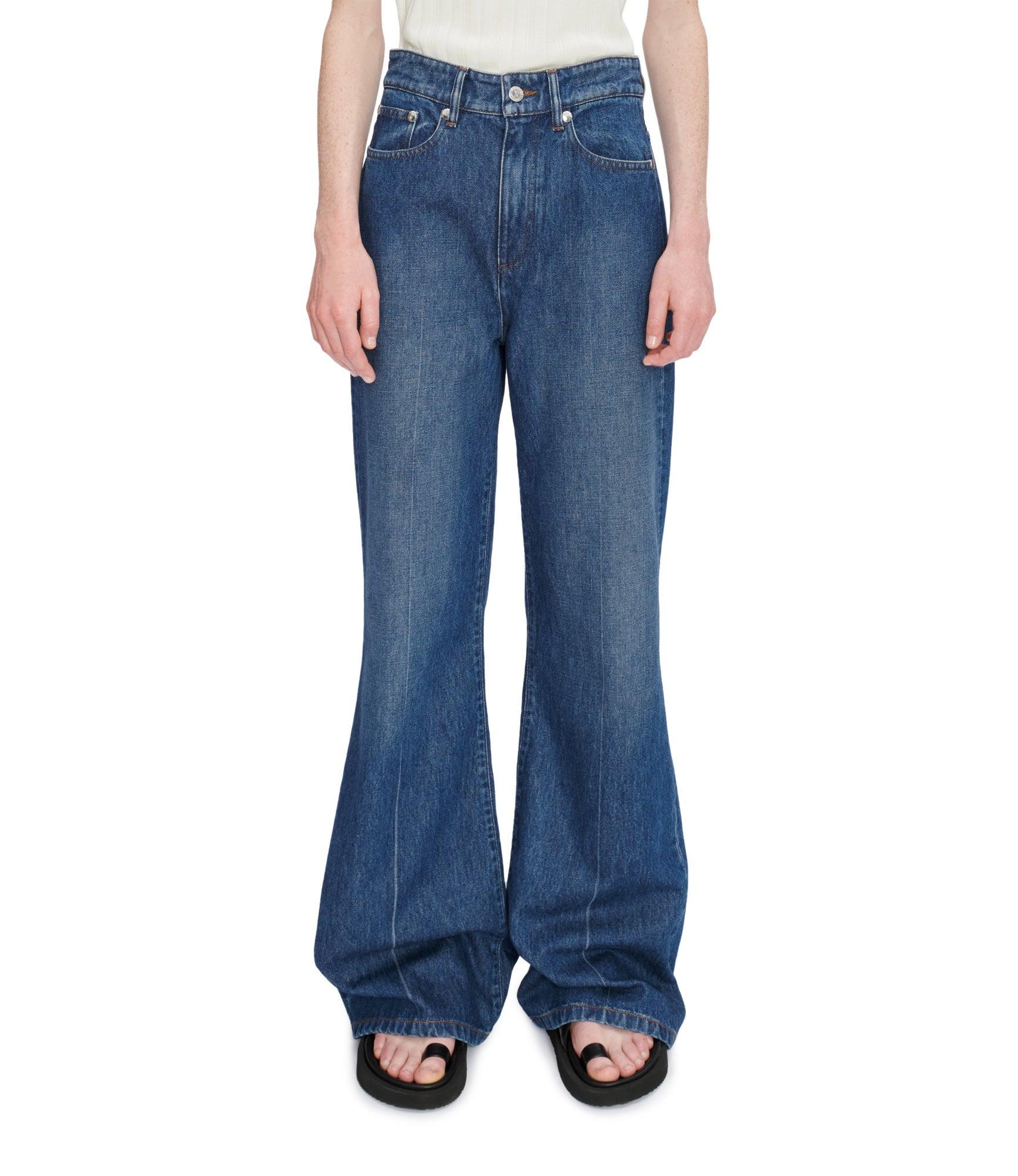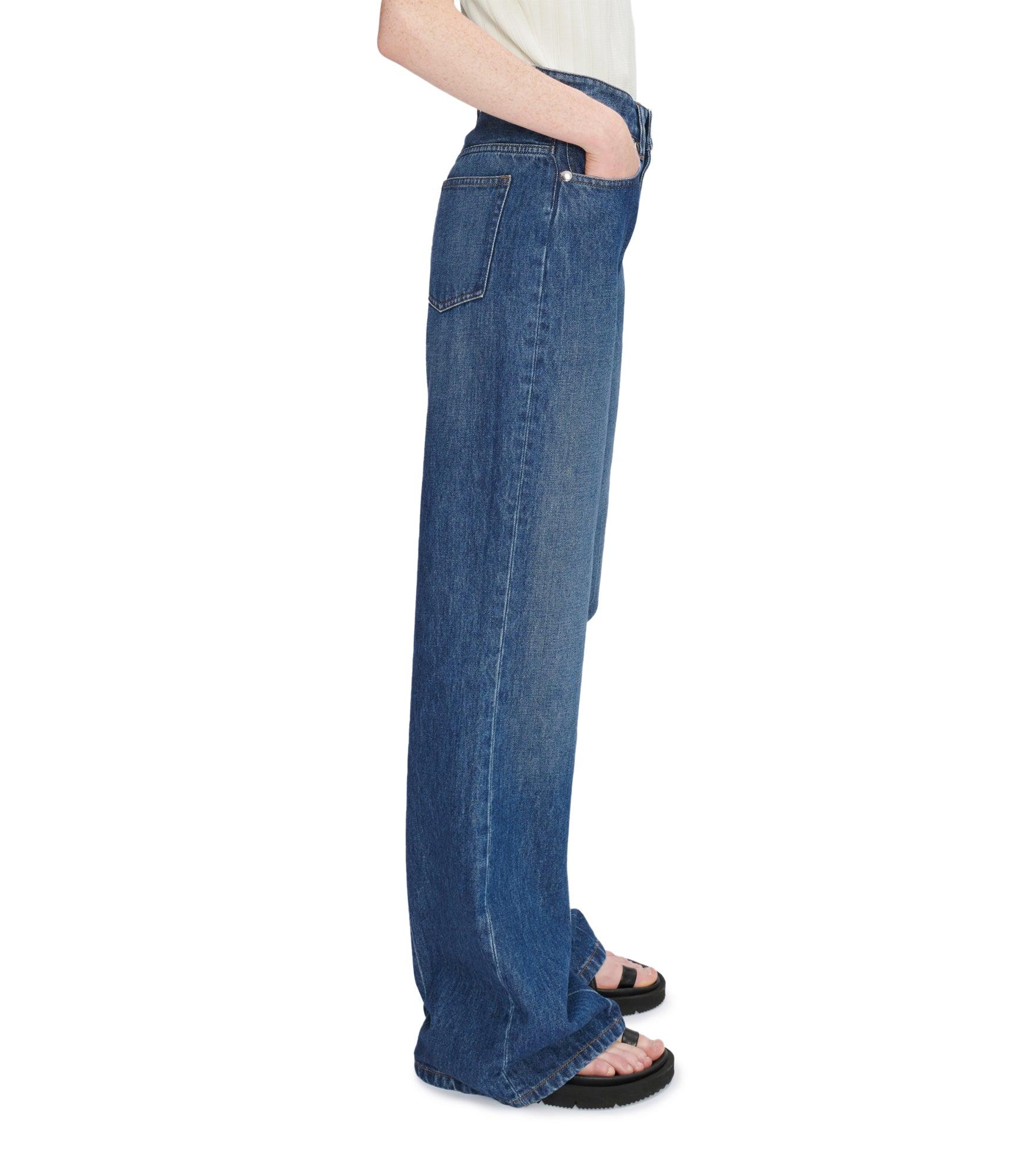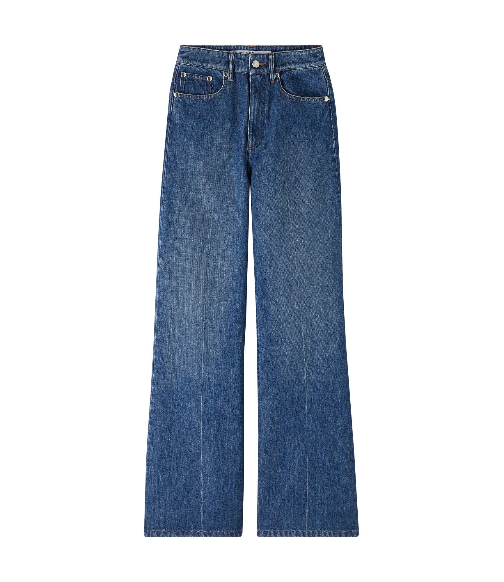 - Straight cut. - High rise. - Wide leg with permanent crease in front and back. - Stonewashed effect, like that of A.P.C. 'Butler' jeans. - Silvertone metal rivets, the signature of the line. - Caramel and blue topstitching. - 100% cotton derived from organic farming.