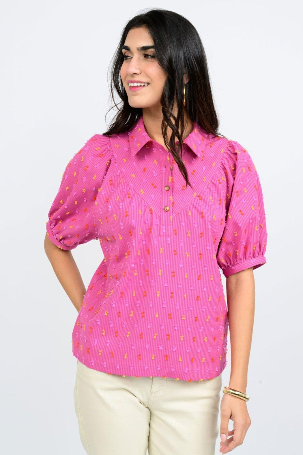 Add a pop of color to your wardrobe with this striped bright pink 100% cotton blouse. Eye-catching tufts of colorful thread add bursts of excitement everywhere you look. Match its energy by pairing with bright yellow bottoms, or let it be the star of the outfit by pairing with a neutral pant.