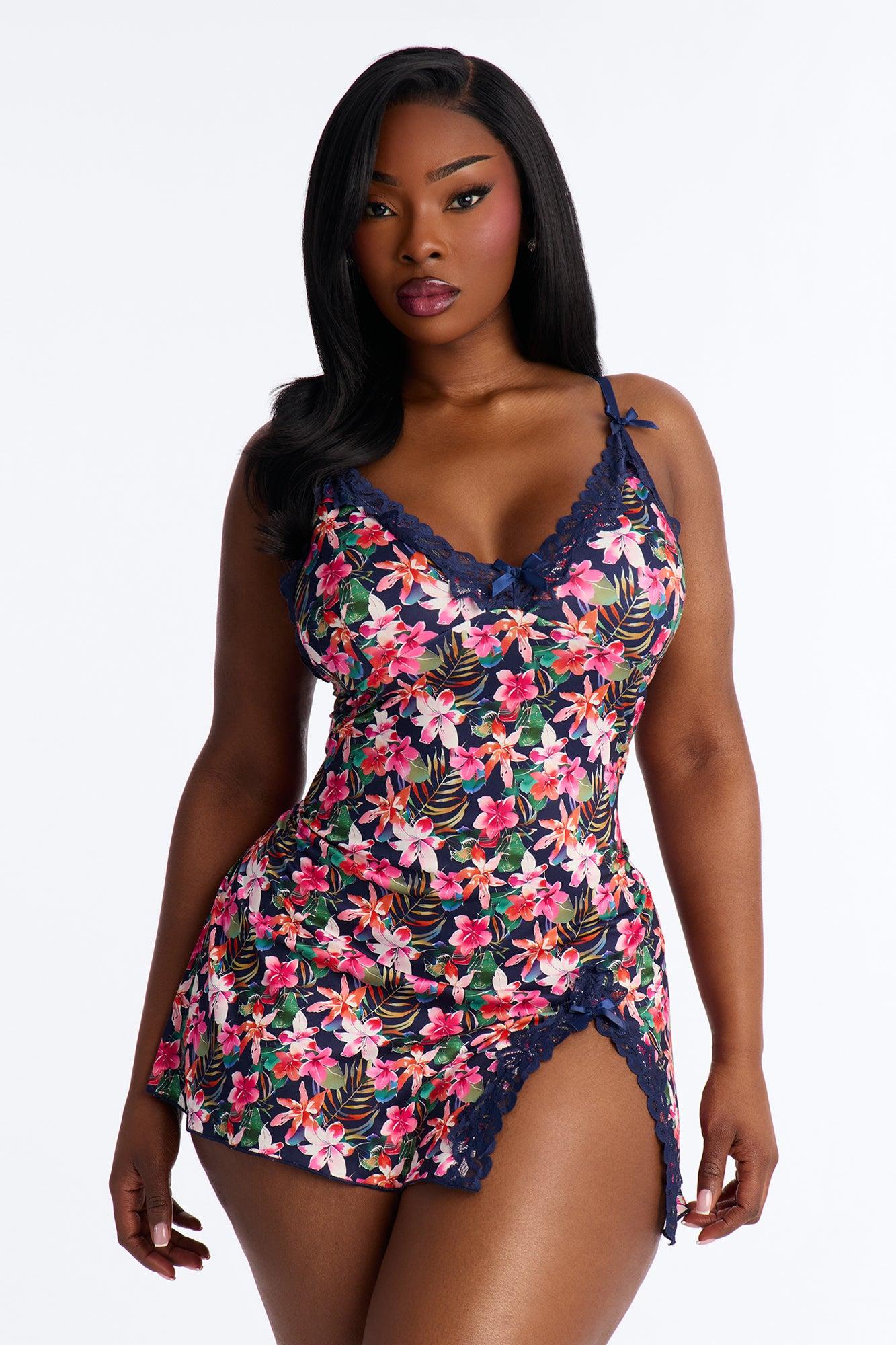 Available In Black/Brown, Black/combo, Brown/Brown, Brown/combo And Navy/combo. Babydoll Floral Print Adjustable Straps Bow Lace Trim Mini Side Slit Stretch Final Sale Self: 90% Polyester 10% Spandex Contrast: 95% Nylon 5% Spandex Imported California Proposition 65WARNING: Cancer and Reproductive Harm - www.P65Warnings.ca.gov.