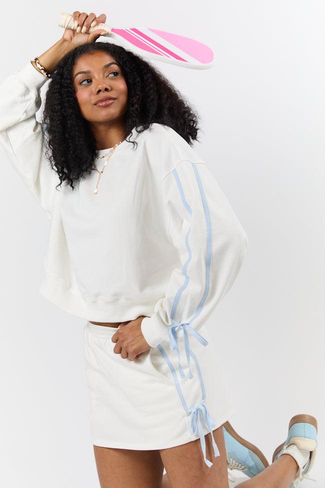 Details White Bow Skort Fabric has stretch Elastic waistband, bow detail on side, functional pockets Lined with shorts Size small inseam: 1.75" Material and Care Self: 85% cotton 15% polyester, lining: 98% polyester 2% spandex Hand wash cold, dry flat Patterns may vary Materials may have natural variations Colors may vary from different viewing devices.