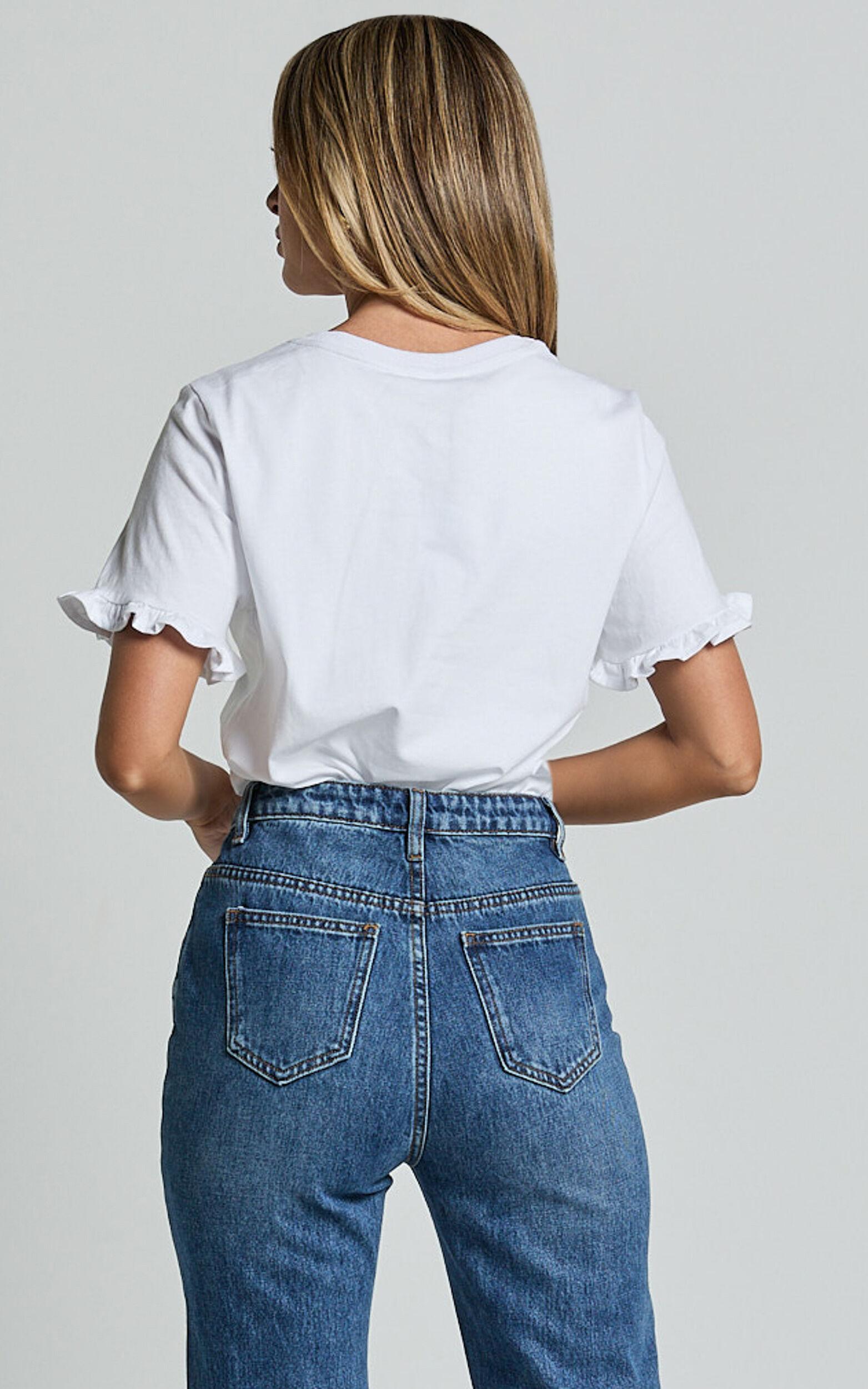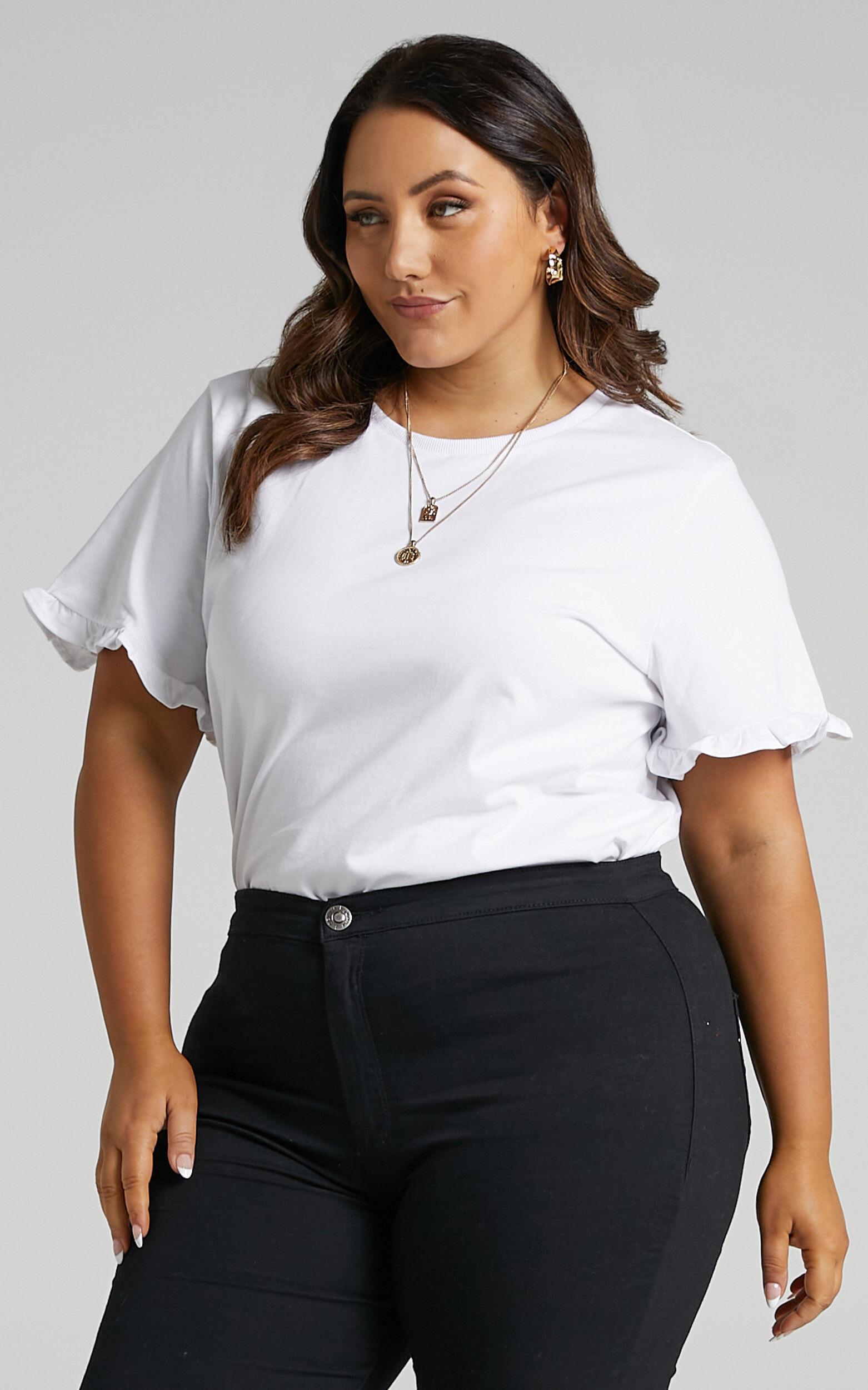 Add a new trusty white tee to your collection with the Closer to Home Ruffle Sleeve Tee! This t-shirt sports a slightly boxy but standard fit with a sweet ruffle trim on the sleeves. It’s super versatile and easy to style with anything in your wardrobe. Roll it up or tuck it into your favourite high-waisted jeans for an easy but cute day look!Shop all Showpo.Product DetailsRound ribbed necklineShort sleeves with ruffle trimStandard fitNo liningSize & FitSize S / 8 length: 55cm / 21.6inFirst model is wearing size S / 8 AU / 4 US / 8 UK / 36 EUFirst model's height is 168cm / 5'6"Second model is wearing size XXXL / 18 AU / 14 US / 18 UK / 46 EUSecond model's height is 176cm / 5'9"Material & CareMade with 65% cotton, 35% polyester, low stretchCold hand wash only, do not soak, do not tumble dry, wash separately