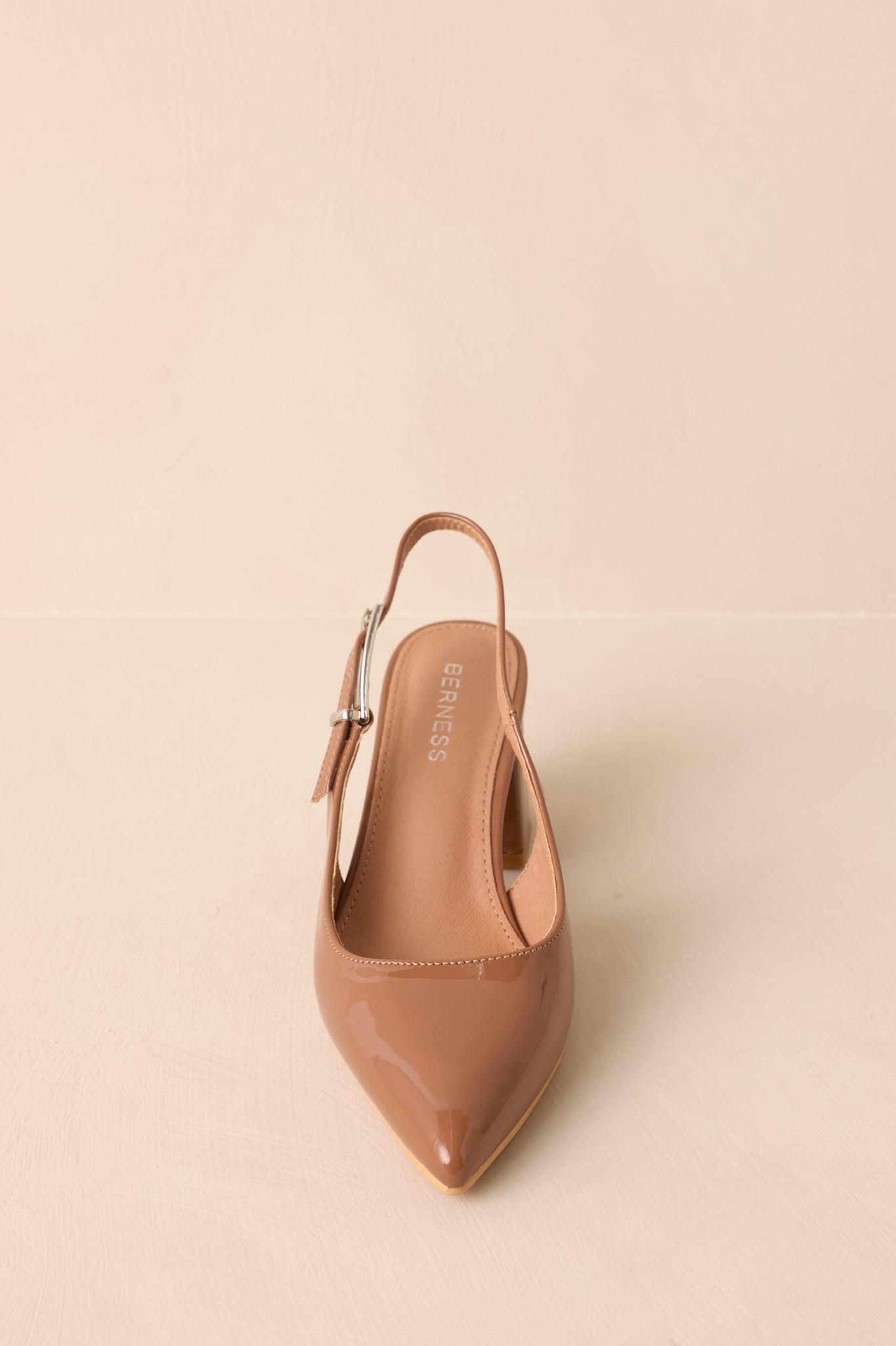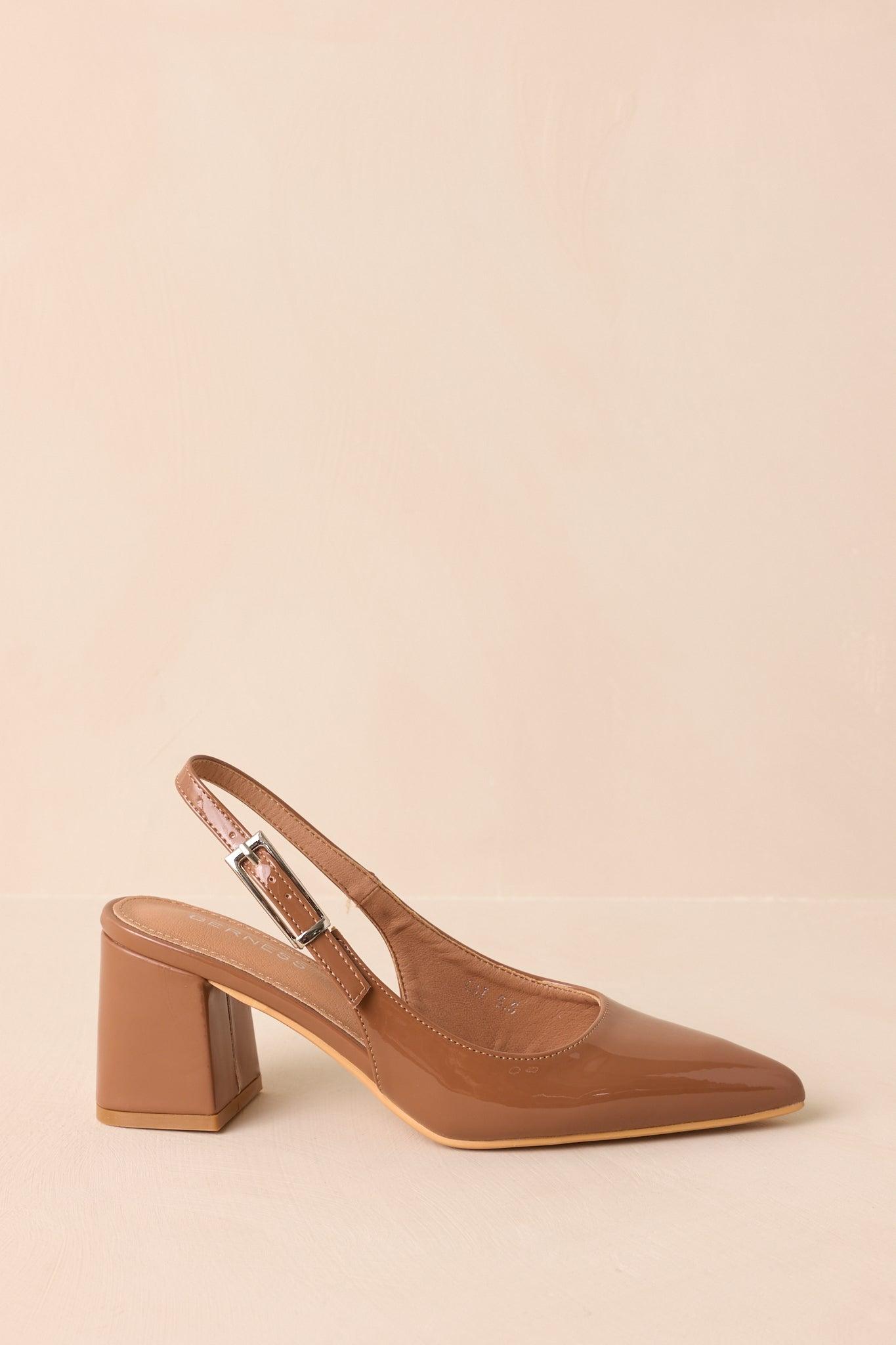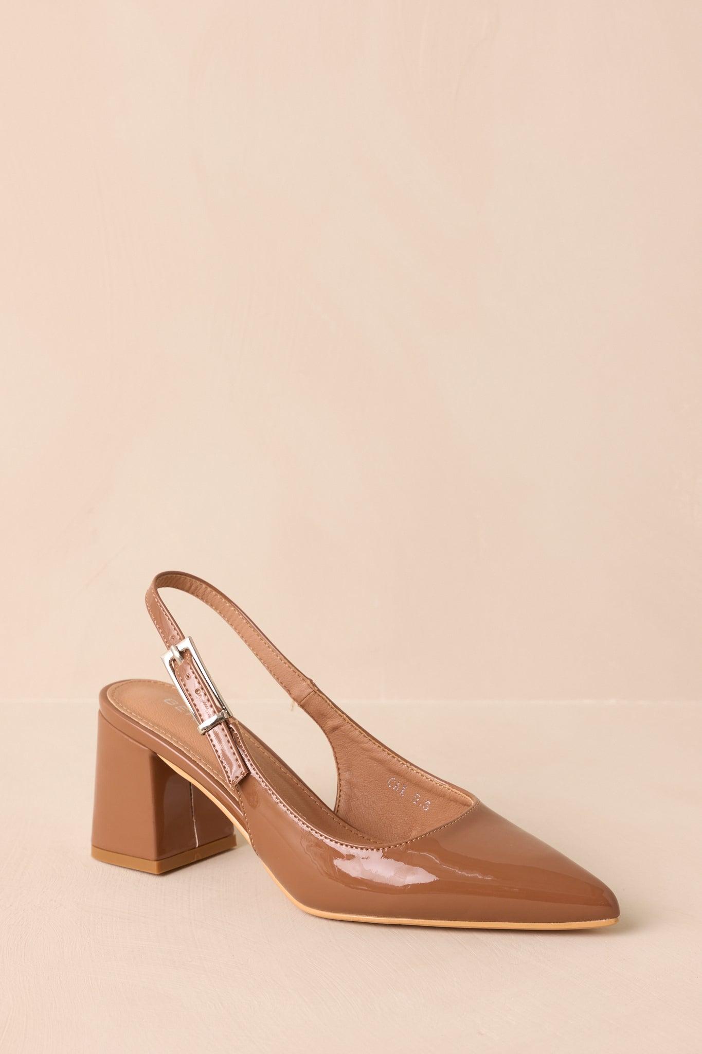 The Cloud Nine Nights Camel Brown Patent Slingback Block Heels lift your look with an easy elegance, made for evenings that feel a little more special. These camel brown heels feature a pointed closed toe, adjustable slingback strap, block heel, and a glossy patent finish. Heel measures 2.75" Man made materials Non-skid sole Manufactured in China Designed in The USA True to Size, Wide Foot Friendly