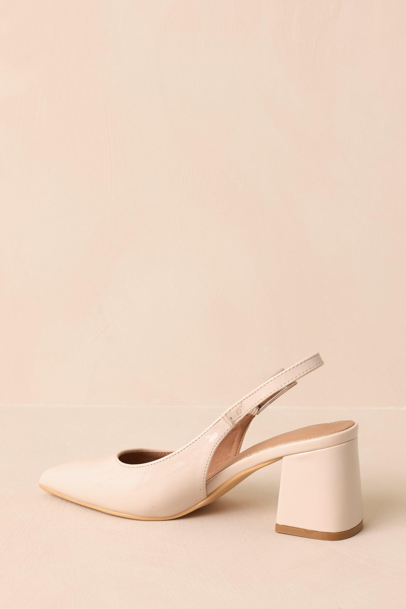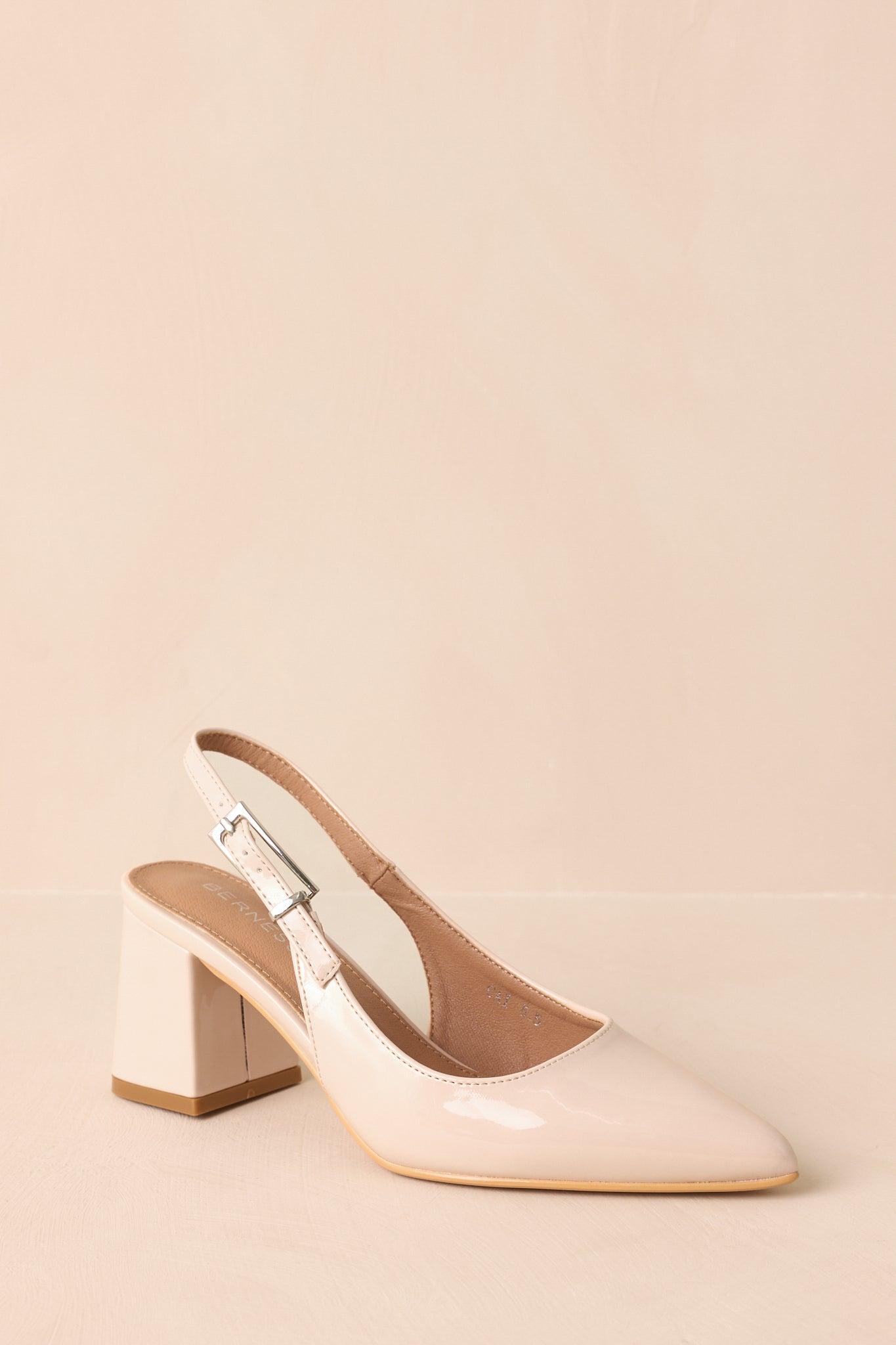 The Cloud Nine Nights Ivory Patent Slingback Block Heels lift your look with an easy elegance, made for evenings that feel a little more special. These beige heels feature a pointed closed toe, adjustable slingback strap, block heel, and a glossy patent finish. Heel measures 2.75" Man made materials Non-skid sole Manufactured in China Designed in The USA True to Size, Wide Foot Friendly