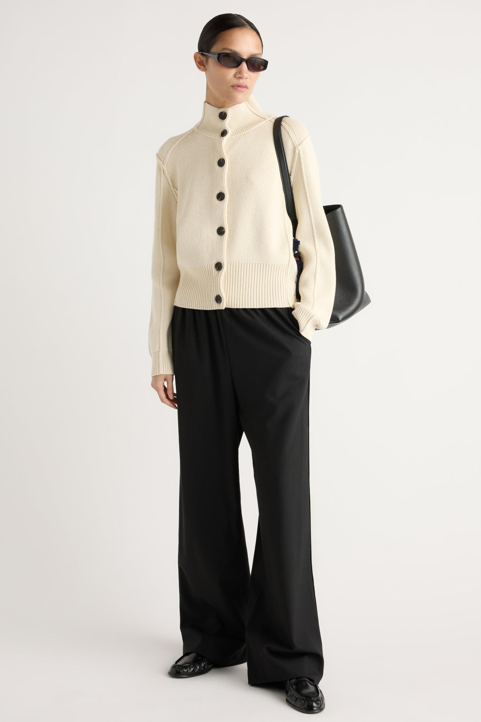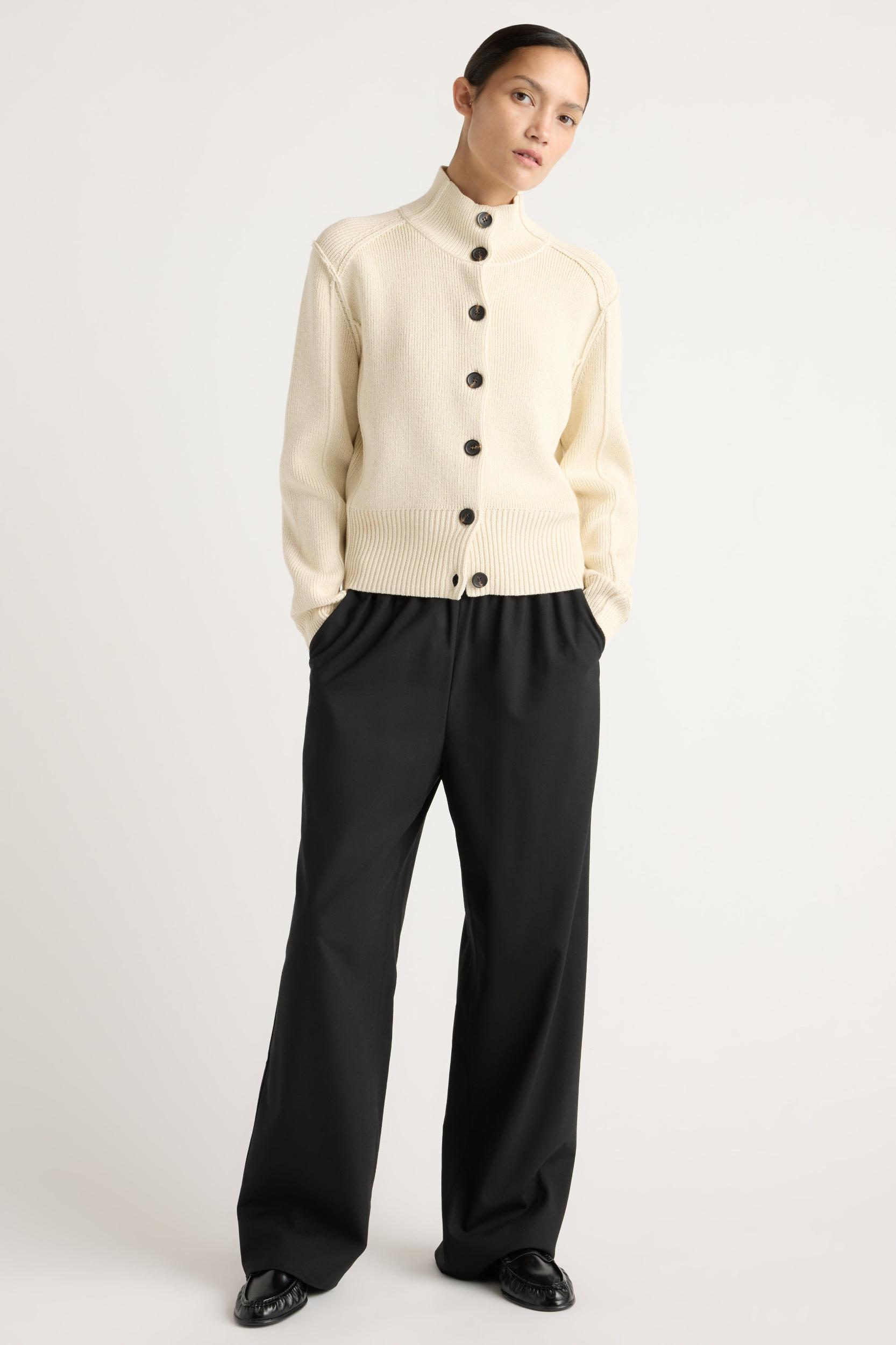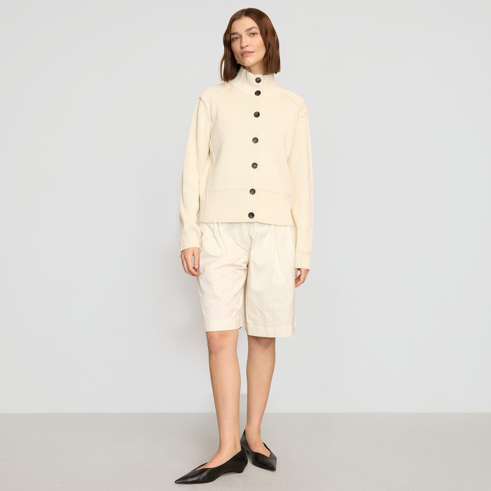 A modern mock-neck cardigan designed with exposed seams and contrasting buttons — Clove is the perfect mid-weight layer for any casual look.