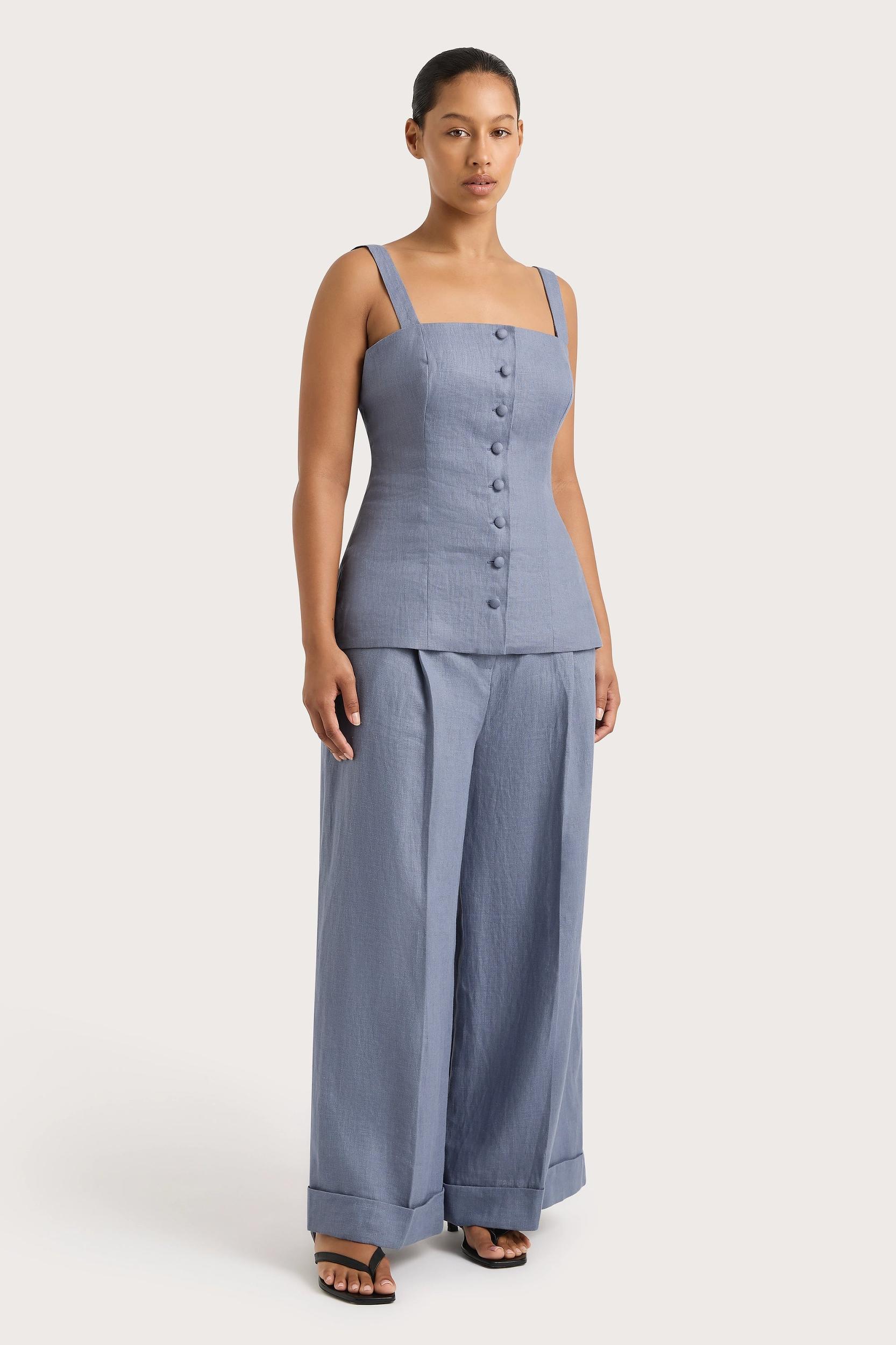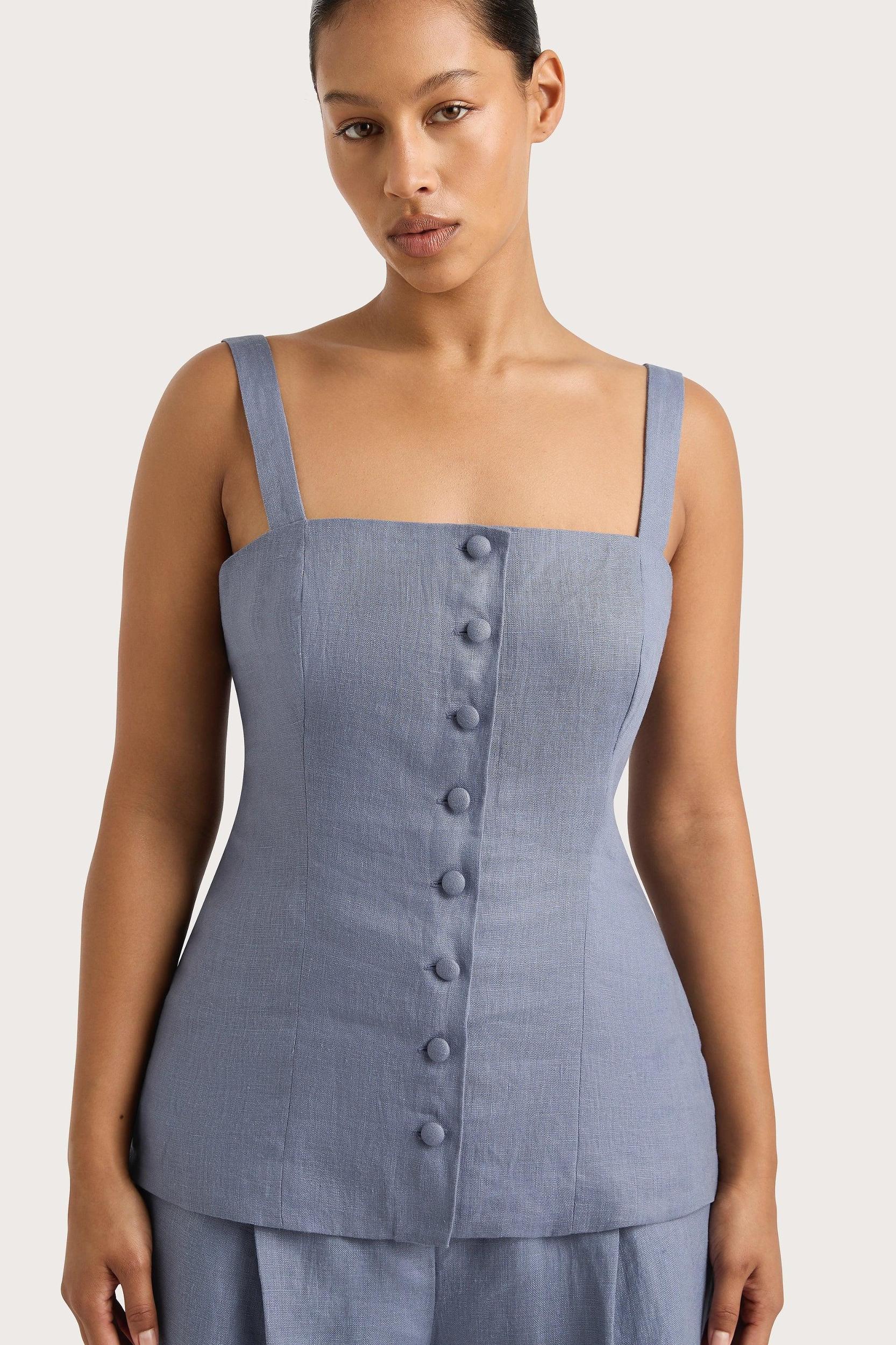 A sleeveless top, designed from a signature 100% European Flax® linen fabrication in a soft cornflower blue. It features wide straps and a straight neckline, with matching buttons down the front. Fitted through the body and cropping around the hips, it is fully lined so will hold shape. Style with the Clove Trouser for effortless everyday wear. This style is true to size. Please note there is no elastic woven into the fabric so it does not offer any additional stretch. The button detailing is mocked on the front, with an invisible zip opening at the side.