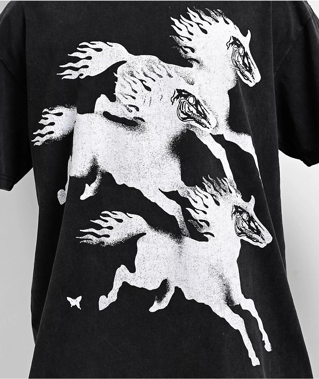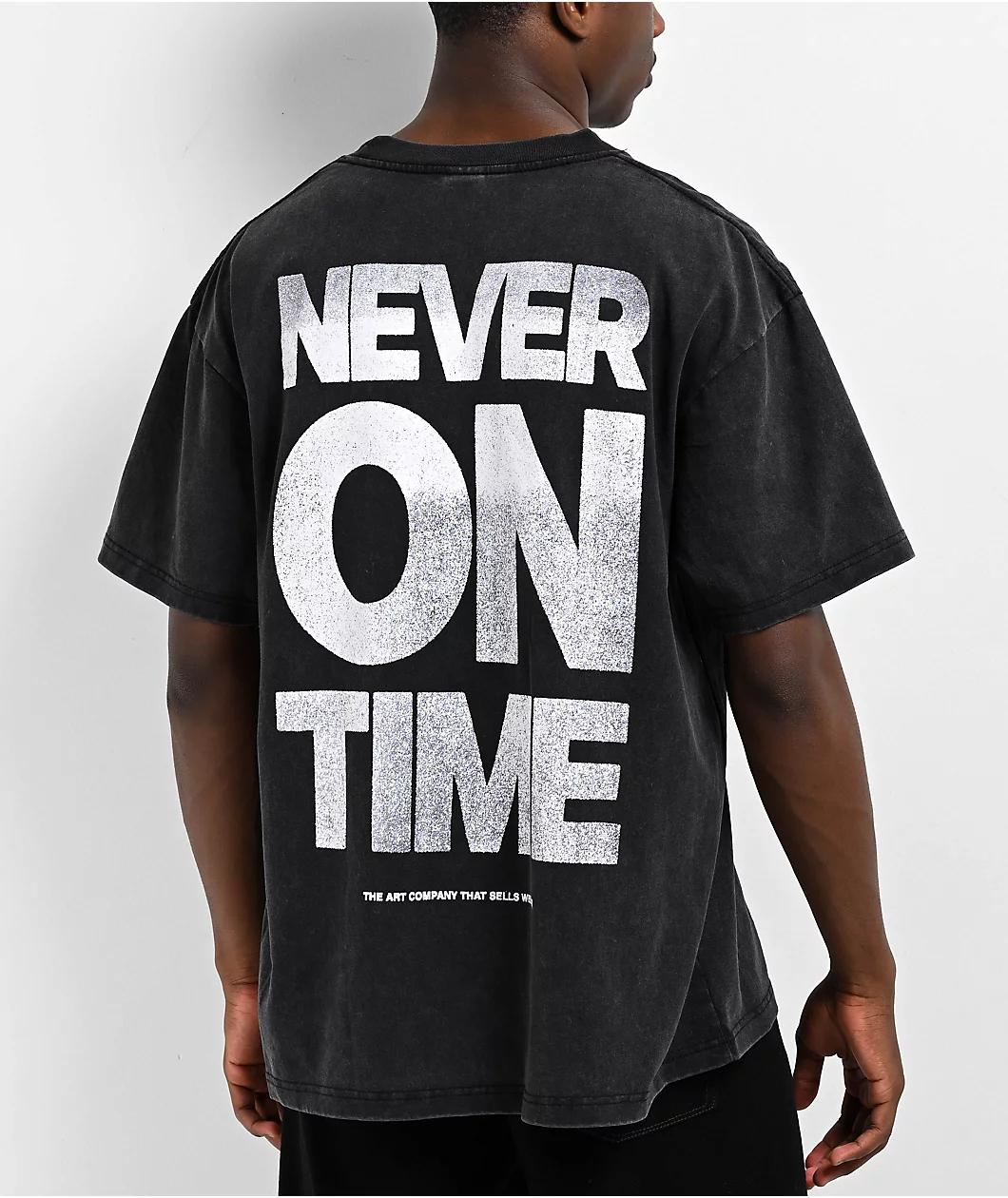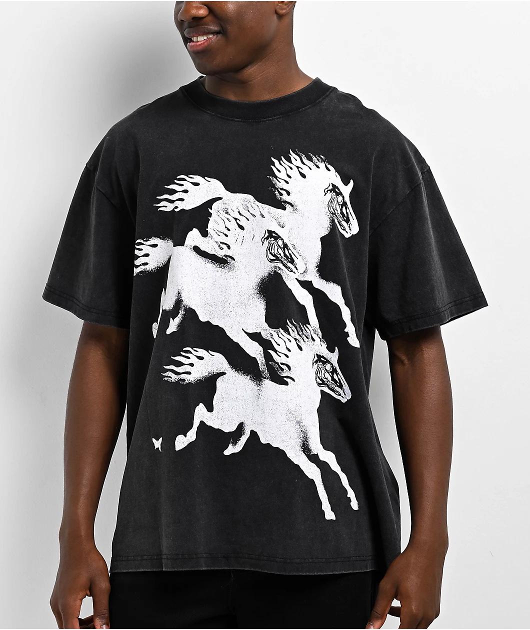 Treated with a black vintage wash for a unique faded effect, CLSICS introduces their Never On Time t-shirt; made using durable 100% cotton. The relaxed silhouette features a flaming horse design across the front, while "Never on time" is printed bold