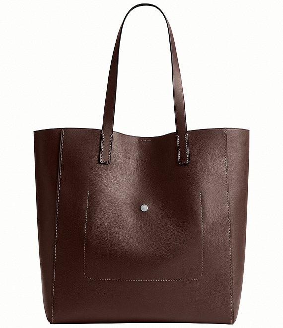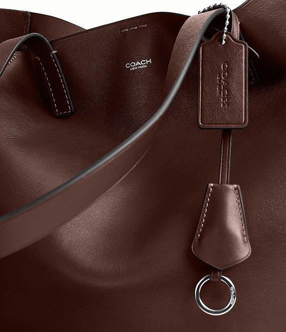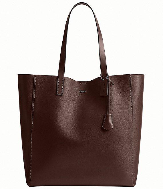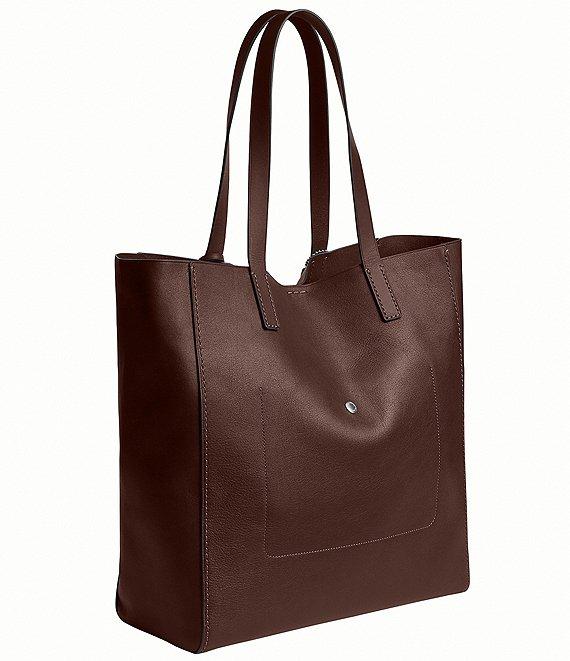 From COACH, this tote bag features: Natural grain leather and vegetable-tanned leather Inside snap pocket Removable zip pouch Magnetic snap closure Handles with 9.75" drop Outside snap pocket Fits a 16" laptop Dimensions approx.: 14" L x 15 1/4" H x 6 1/2" W Imported.