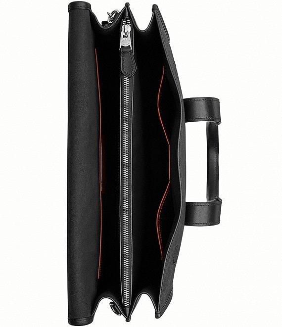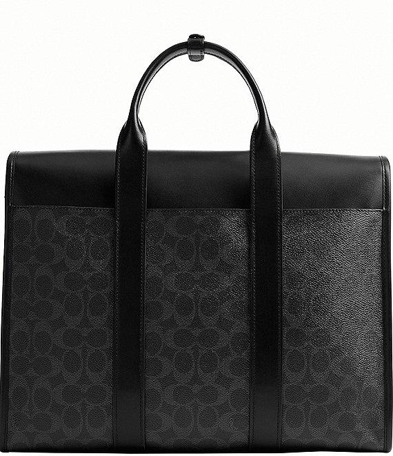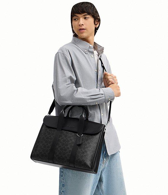From COACH, this portfolio bag features: Signature coated canvas/refined calfskin leather design Interior cell phone and multi-function pockets Outside magnetic pocket Center zippered compartment Magnetic snap closure Fabric lining Handle with 3 ½” drop Detachable strap with 23” drop for shoulder or crossbody wear Fits 15” laptop Approx. 15” long x 11 ¾” tall x 4” wide Signature coated canvas/refined calfskin leather Spot clean Imported.