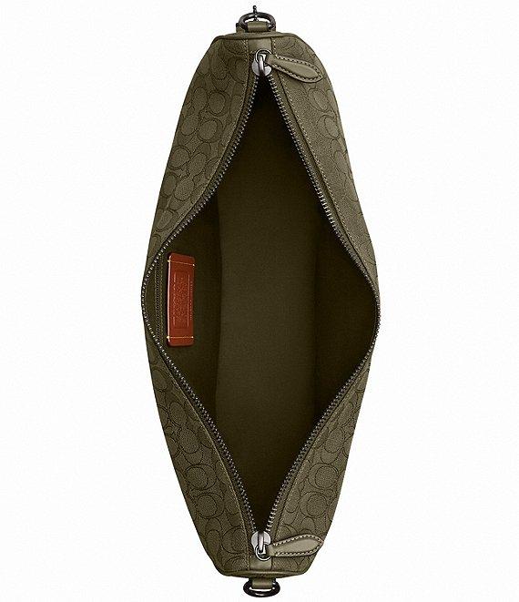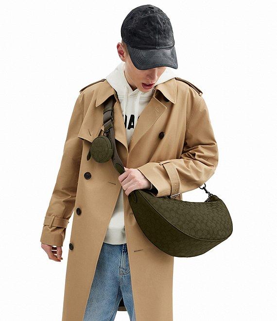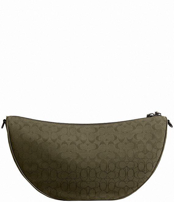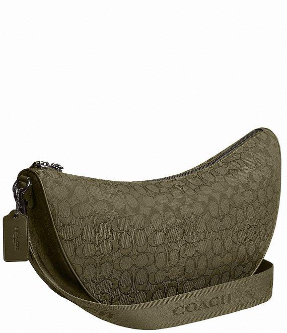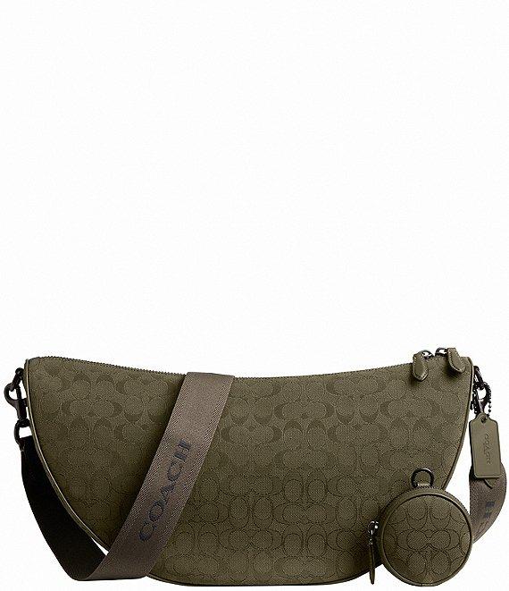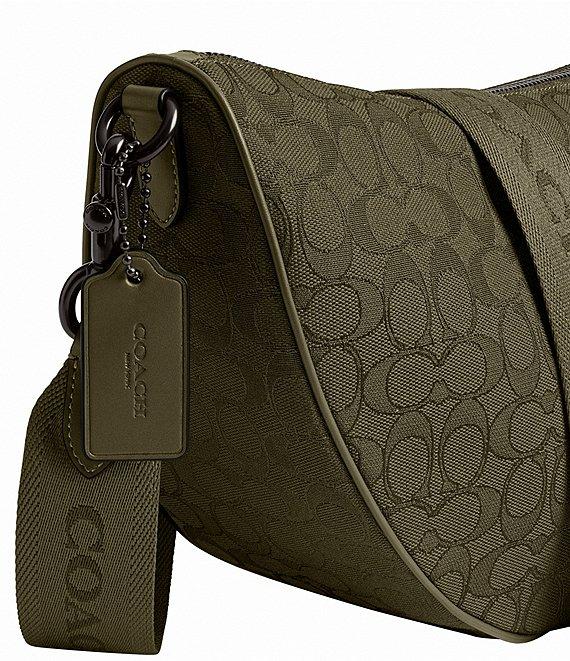 From Coach, this bag features:Soft, signature jacquard refined calfskin leatherRemovable round pouchZippered closureDetachable strap with approx. 26” lengthCrossbody wear, approx. 17” long x 9.25” tall x 5” wideAttached hinged D-ring, approx. 2.75” long x 2.75” tall x 1” wideFabric liningSoft, signature jacquard refined calfskin leatherOne sizeImported.