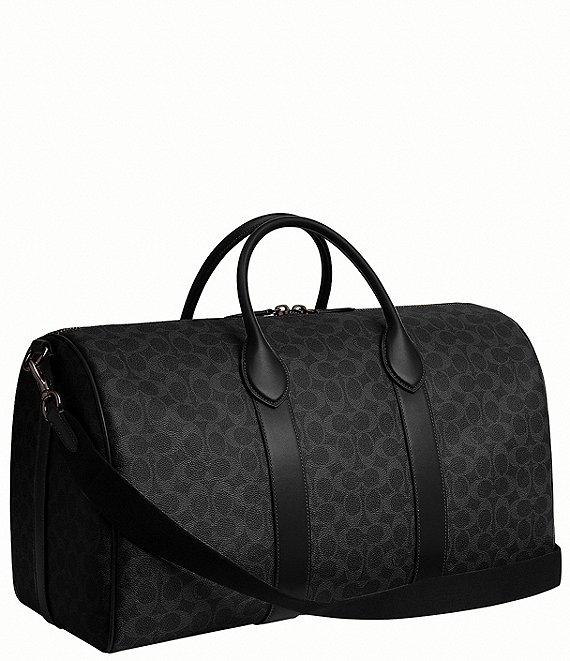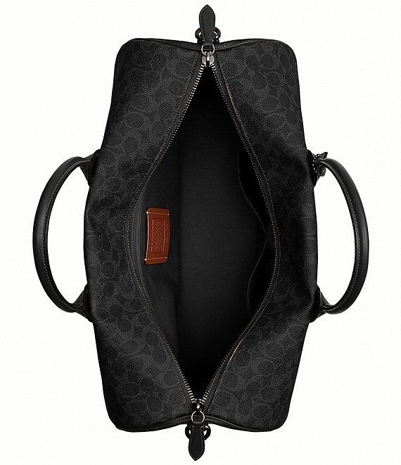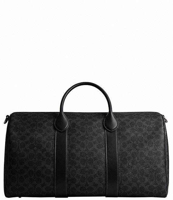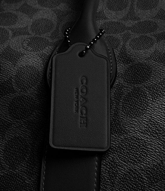 From COACH, this compass bag features: Signature coated canvas and refined calf leather Inside zip and multi-function pockets Zip top closure Fabric lining Handles with 4.5" drop Detachable strap with 25.5" drop for shoulder or crossbody wear Five protective feet at base Dimensions approx.: 19 3/4" L x 11 1/2" H x 9" W Imported.