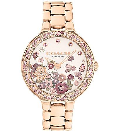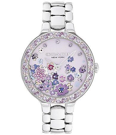 From COACH, this womens watch features: Stainless steel bracelet and case Deployment closureFlower and crystal designMineral crystalQuartz analog movementCase diameter approx. 36mmWater-resistance: 3 ATMImported.