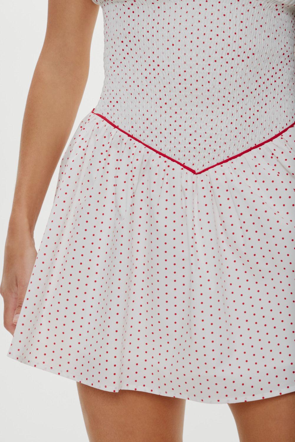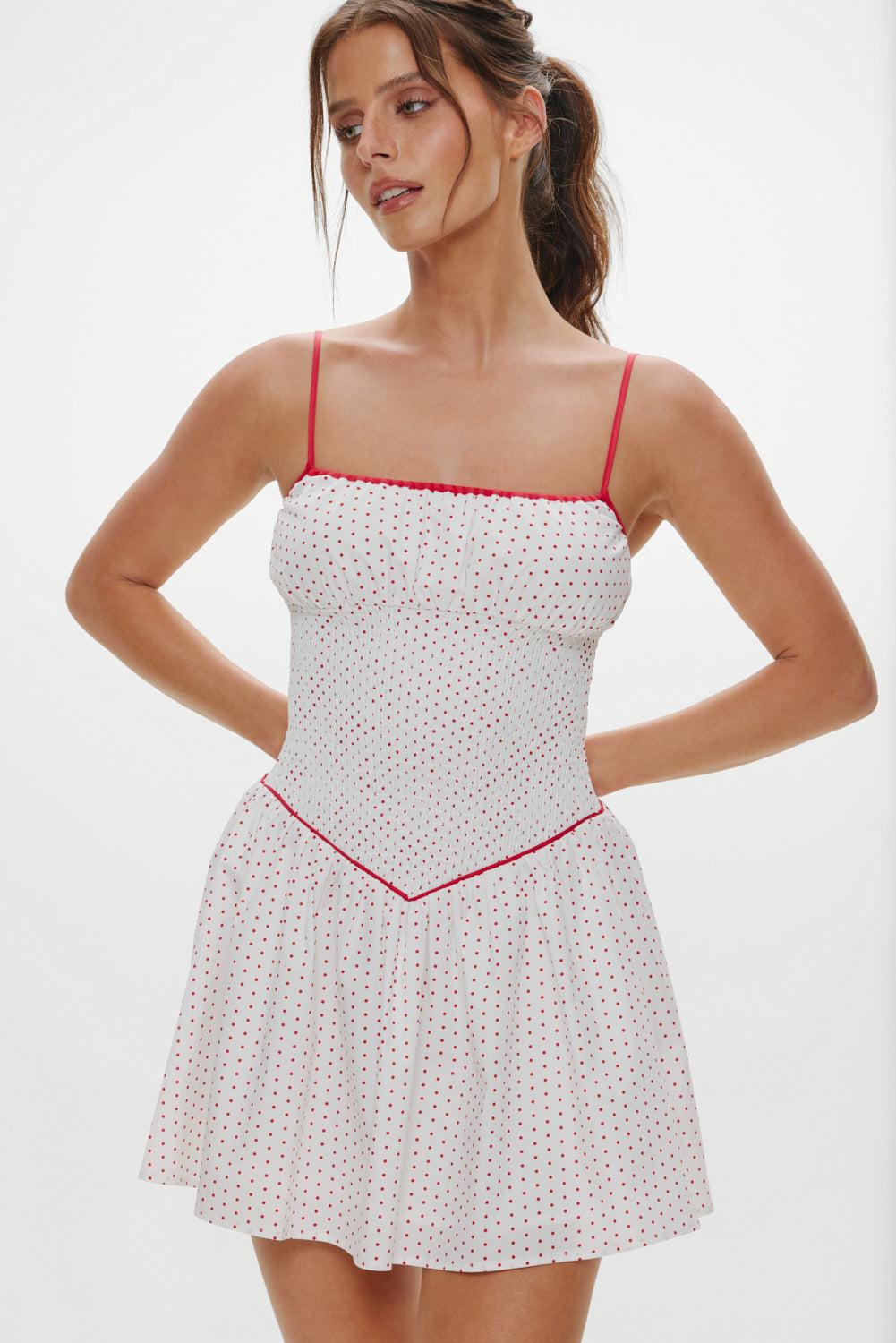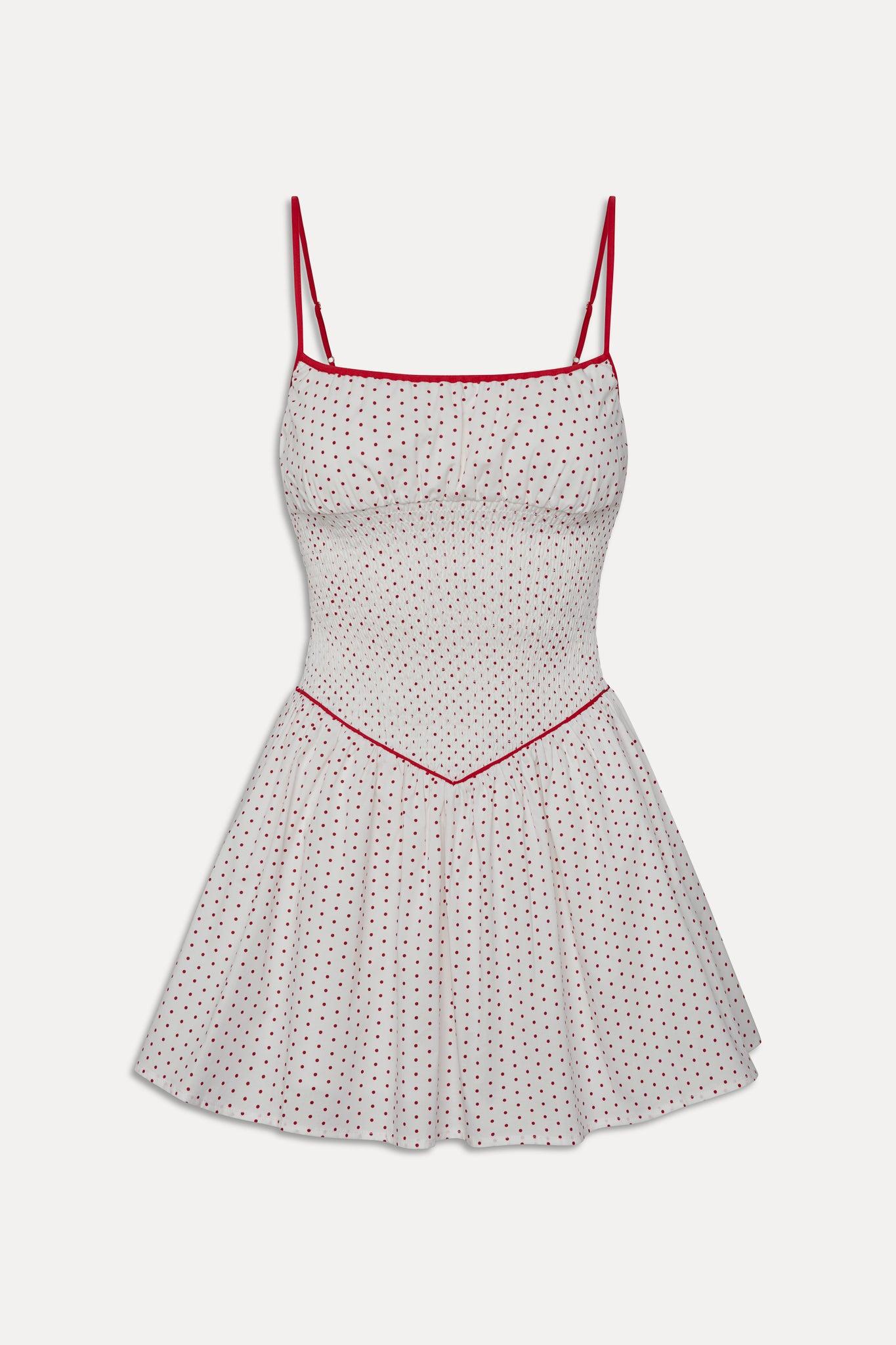 With a fully smocked bodice and a feminine peaked waist, this dress hugs your curves before flaring into a playful skirt. Coast is made for sun-drenched days and warm nights out. Details Cotton poplin fabric Smocked bodice for stretch and shape Peaked waist detail Adjustable shoulder straps Designed in our best-selling Red Dot print