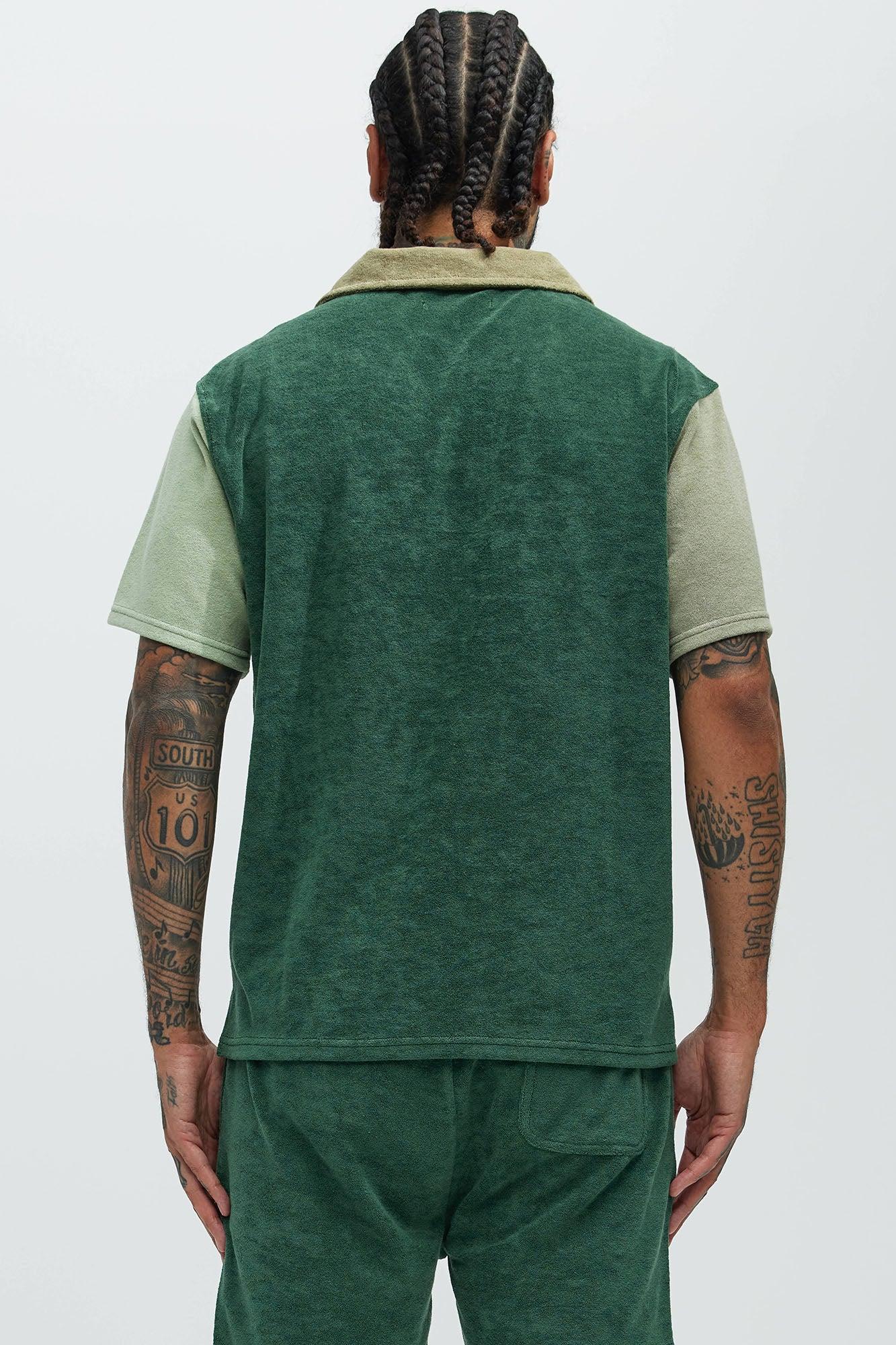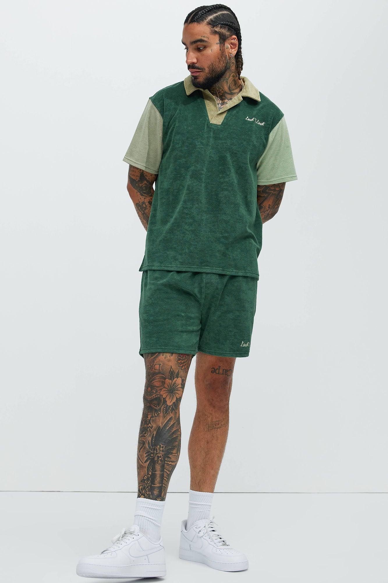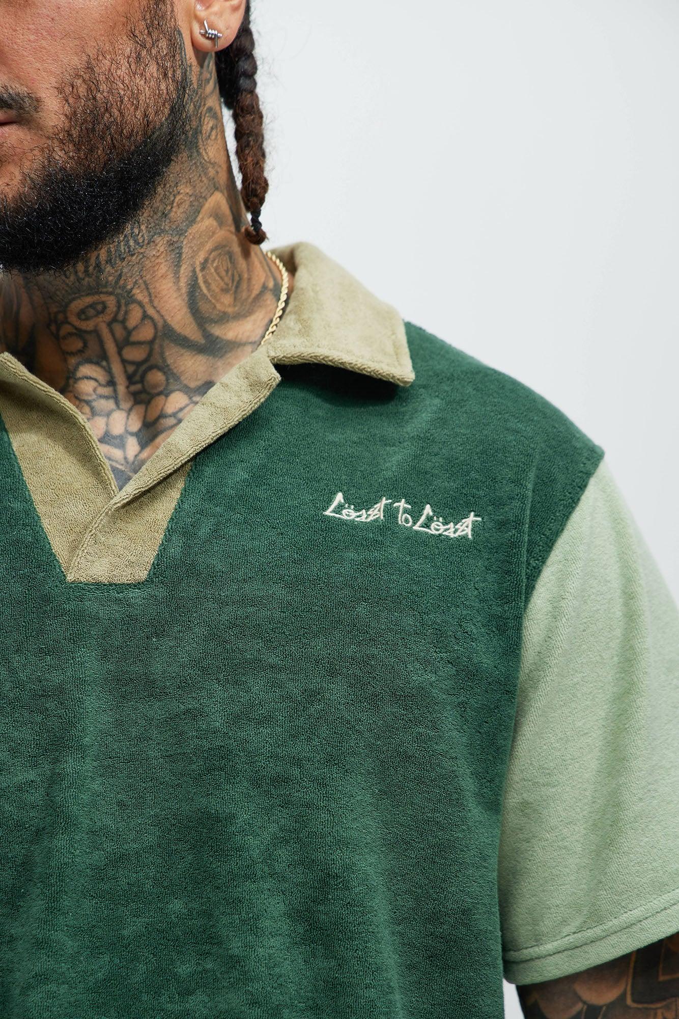 Available In Hunter and Sand Fold Down Collar Short Sleeve Embroidery Detail 55% Cotton 45% Polyester Pair With "Coast To Coast Sweatshorts" Imported