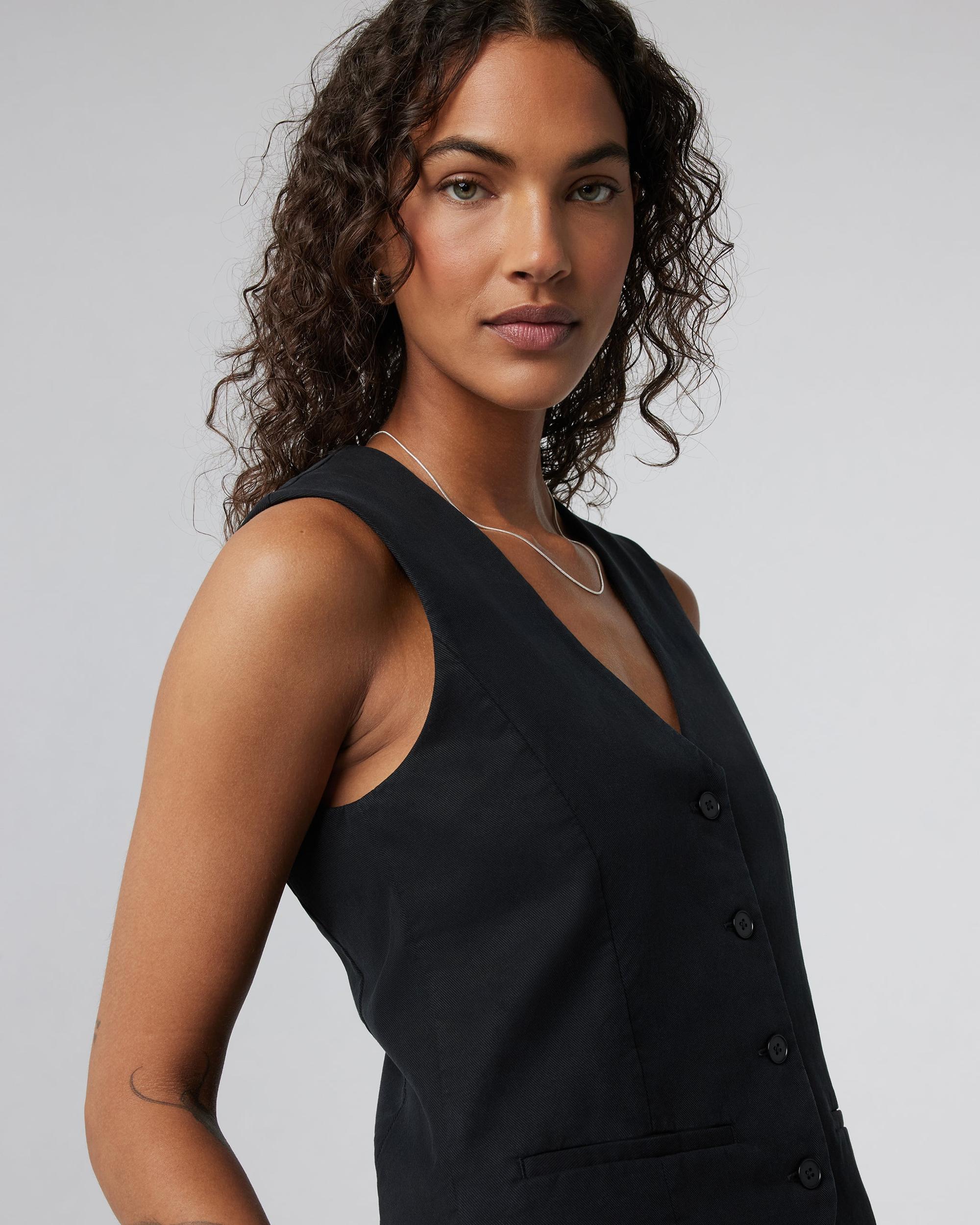 The Coastline Vest is a slim fit, sleeveless button-up vest made with a soft drapey twill. Shop this women's Black vest from Vuori.