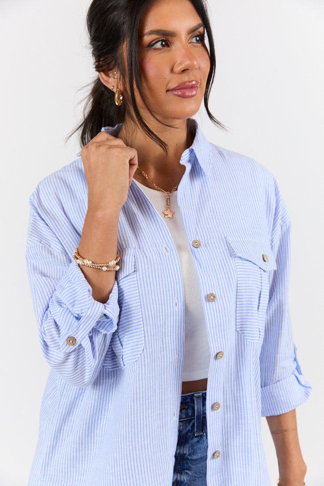 Details Striped Linen Blend Button Down Blue Fabric has no stretch Collared style, functional button up closure, functional pockets Unlined Size small from shoulder to hem: 20" Material and Care 55% cotton 32% viscose 13% linen Machine wash cold, tumble dry low Patterns may vary Materials may have natural variations Colors may vary from different viewing devices.