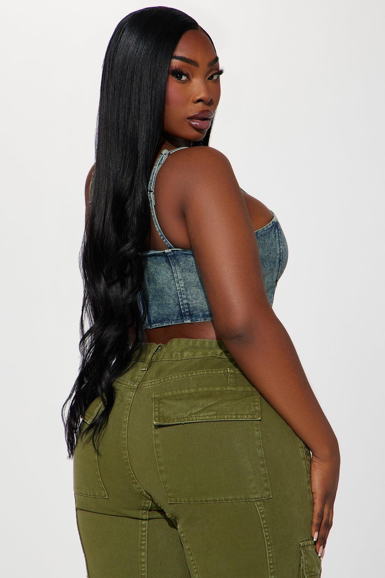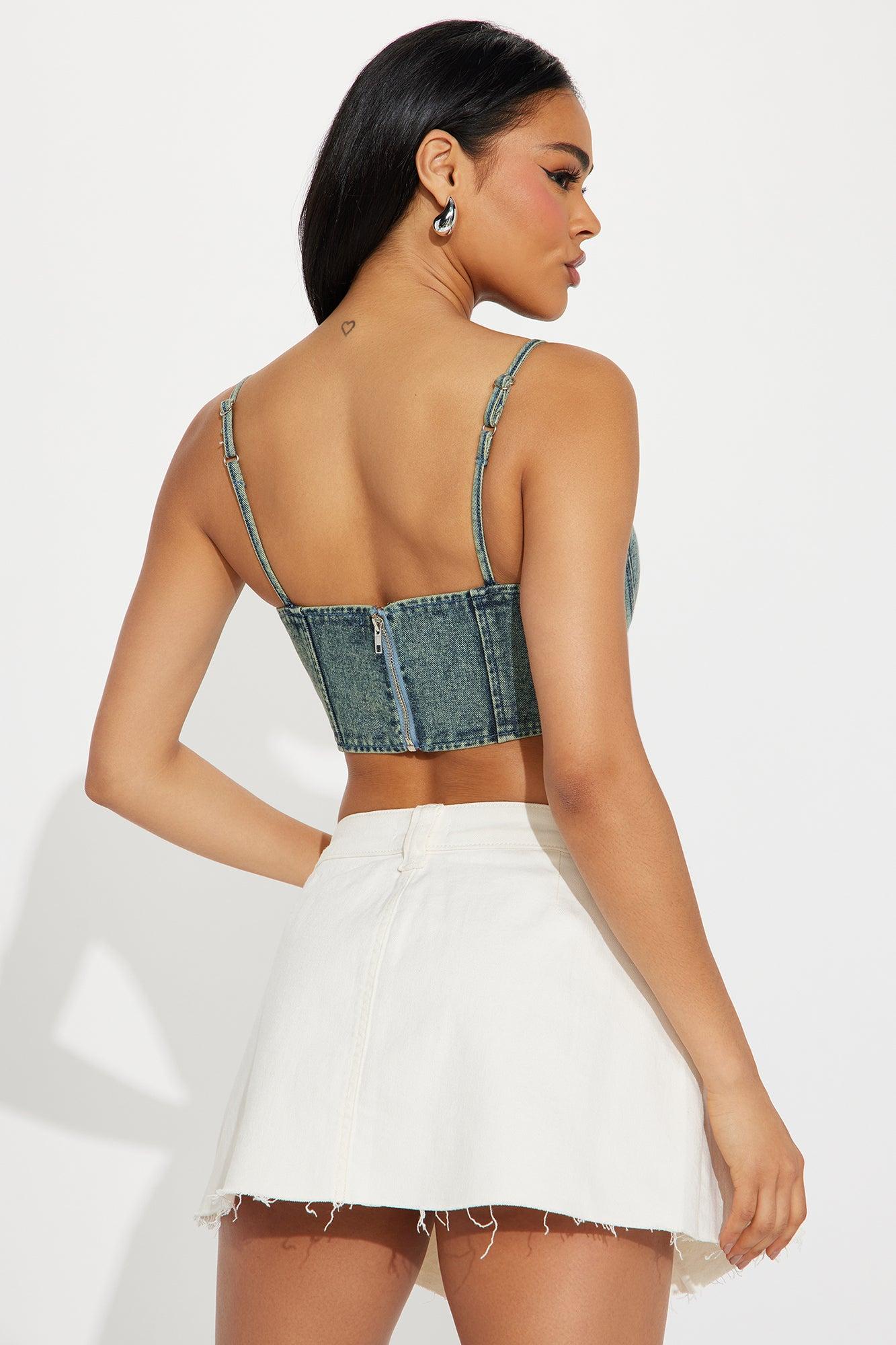 Available In Vintage Wash. Denim Corset Top Sleeveless Adjustable Straps Boning Detail Square Neck Back Zipper Closure V Hem Washed Cropped Non Stretch Disclaimer: Due To The Wash Process, Each Garment Is Unique. 70% Cotton 16% Polyester 14% Rayon Imported