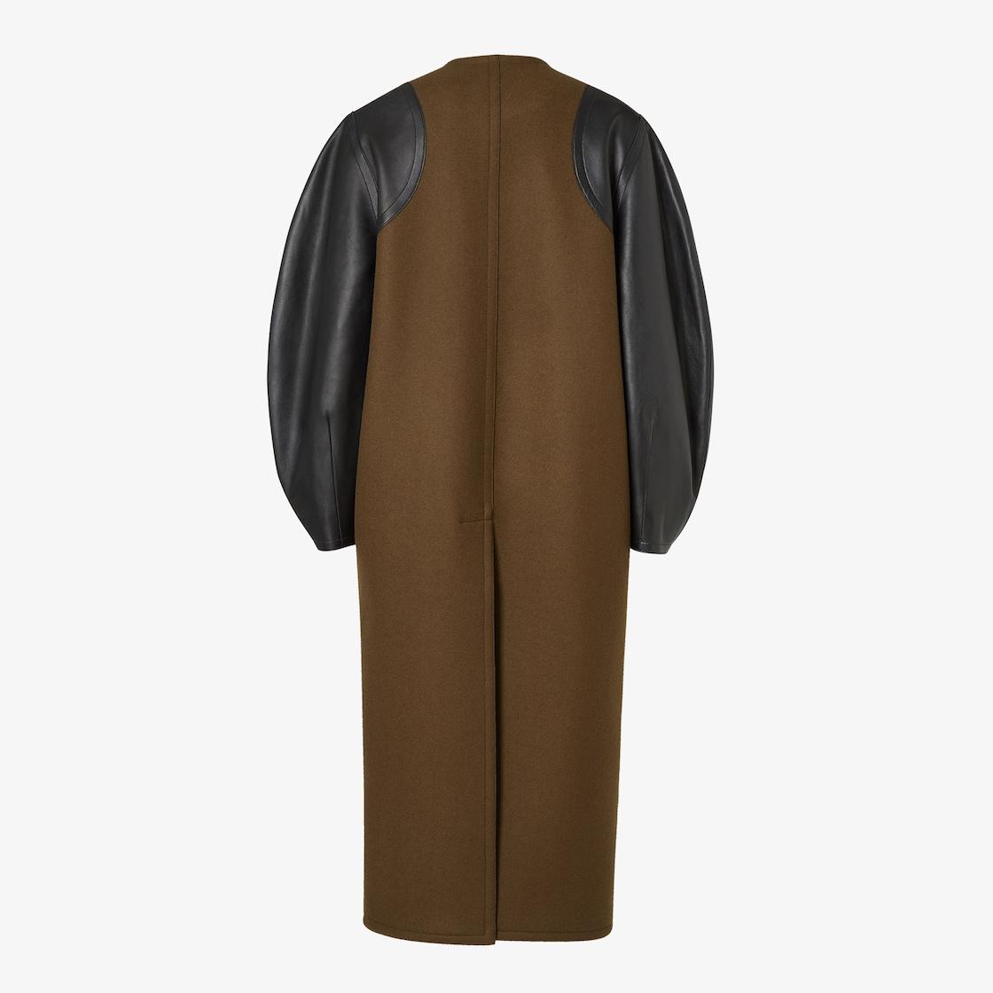 Single-breasted midi coat. Cocoon-style garment with wide long sleeves and crew neckline. Concealed front closure. Made of olive green wool felt. Finished with soft black nappa leather sleeves and patch pockets. Made in Italy