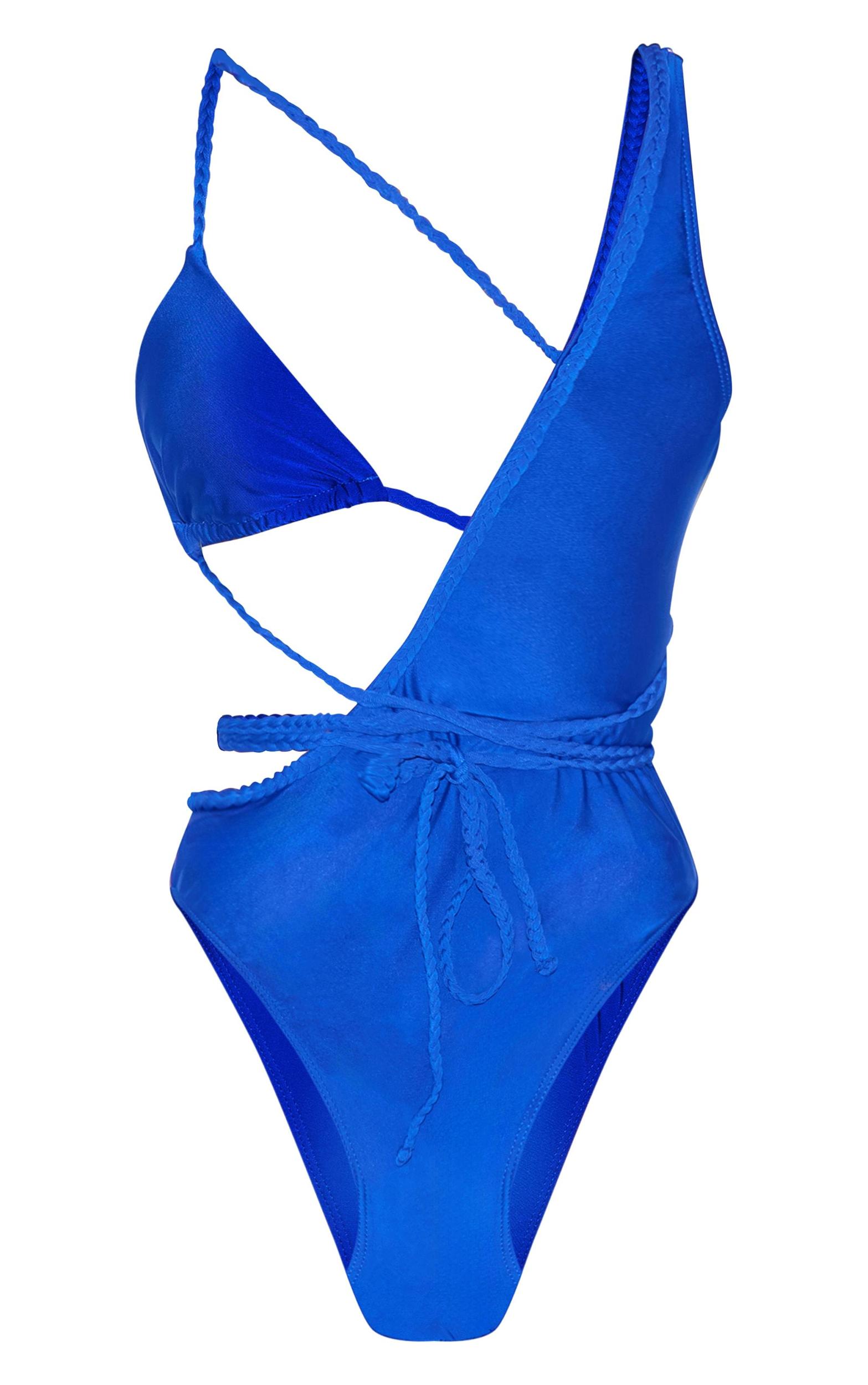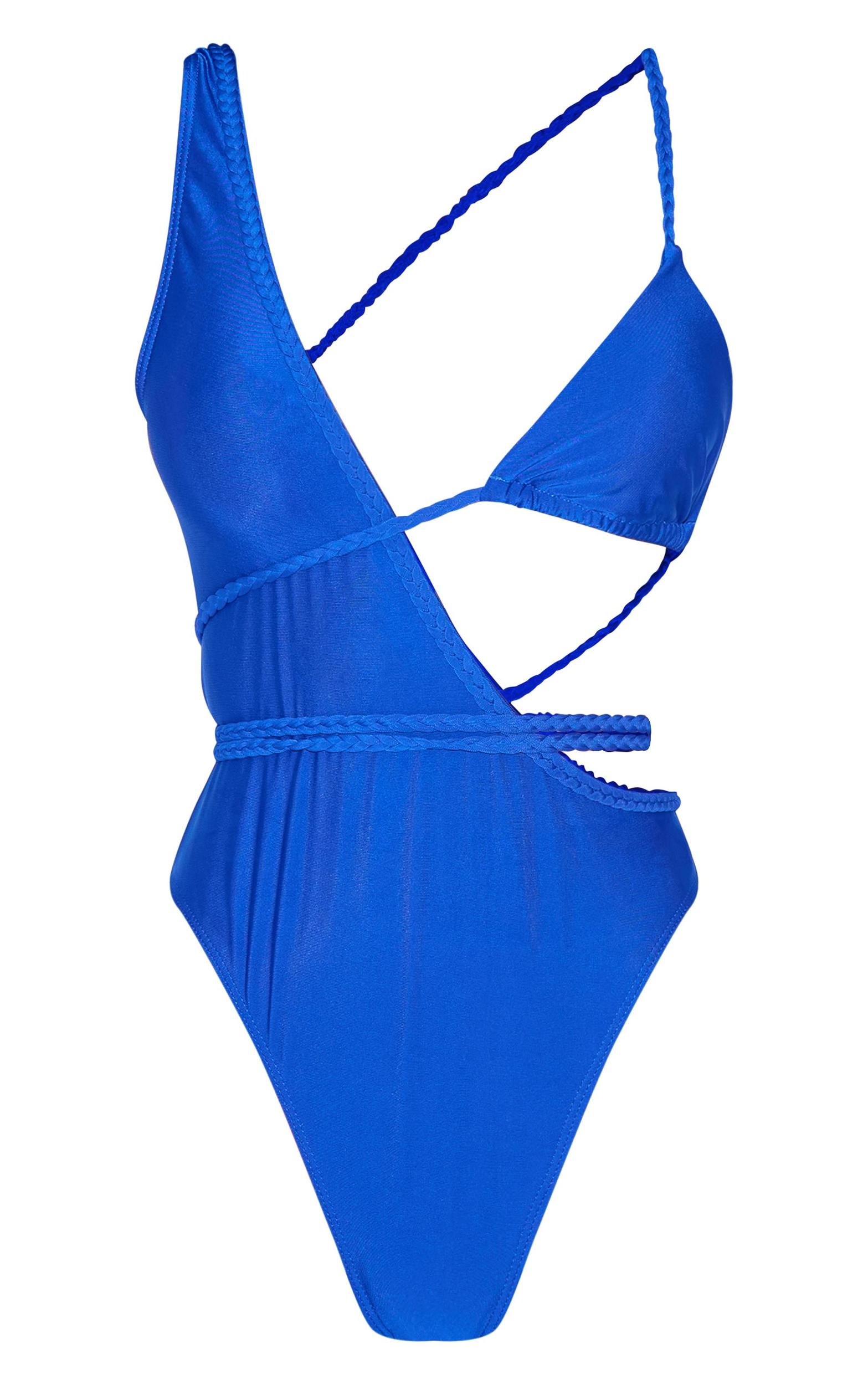 Consider this your cue to make a bold statement poolside. This cobalt swimsuit offers a masterclass in considered design with its striking asymmetric silhouette. Note the intricate plait detailing that elevates this piece beyond the ordinary. The rich cobalt hue flatters all skin tones, making it a vacation essential that exudes effortless confidence. Dial up the impact with sculptural gold earrings from our jewelry collection. Length approx 66cm/26inch (Based on a sample size UK 8) Model wears size UK 8/ EU 36/ AUS 8/ US 4Model Height - 5ft 7inchp]:!mb-4inch>Category: SwimwearProduct type: SwimsuitColor: CobaltMaterial: SwimDesign: PlainOccasion: Day