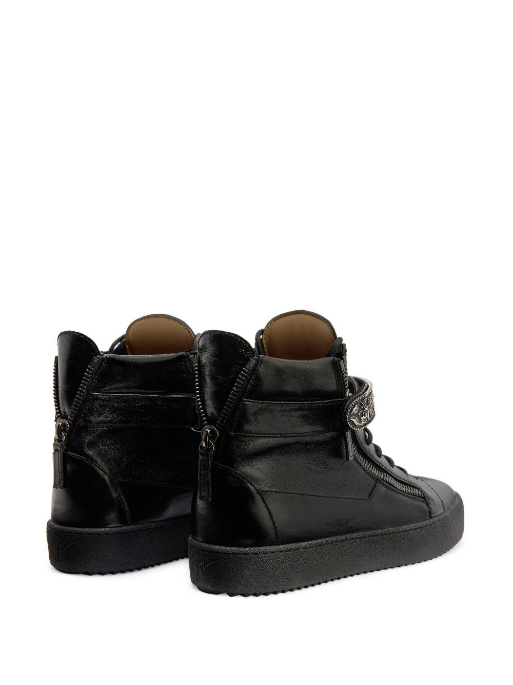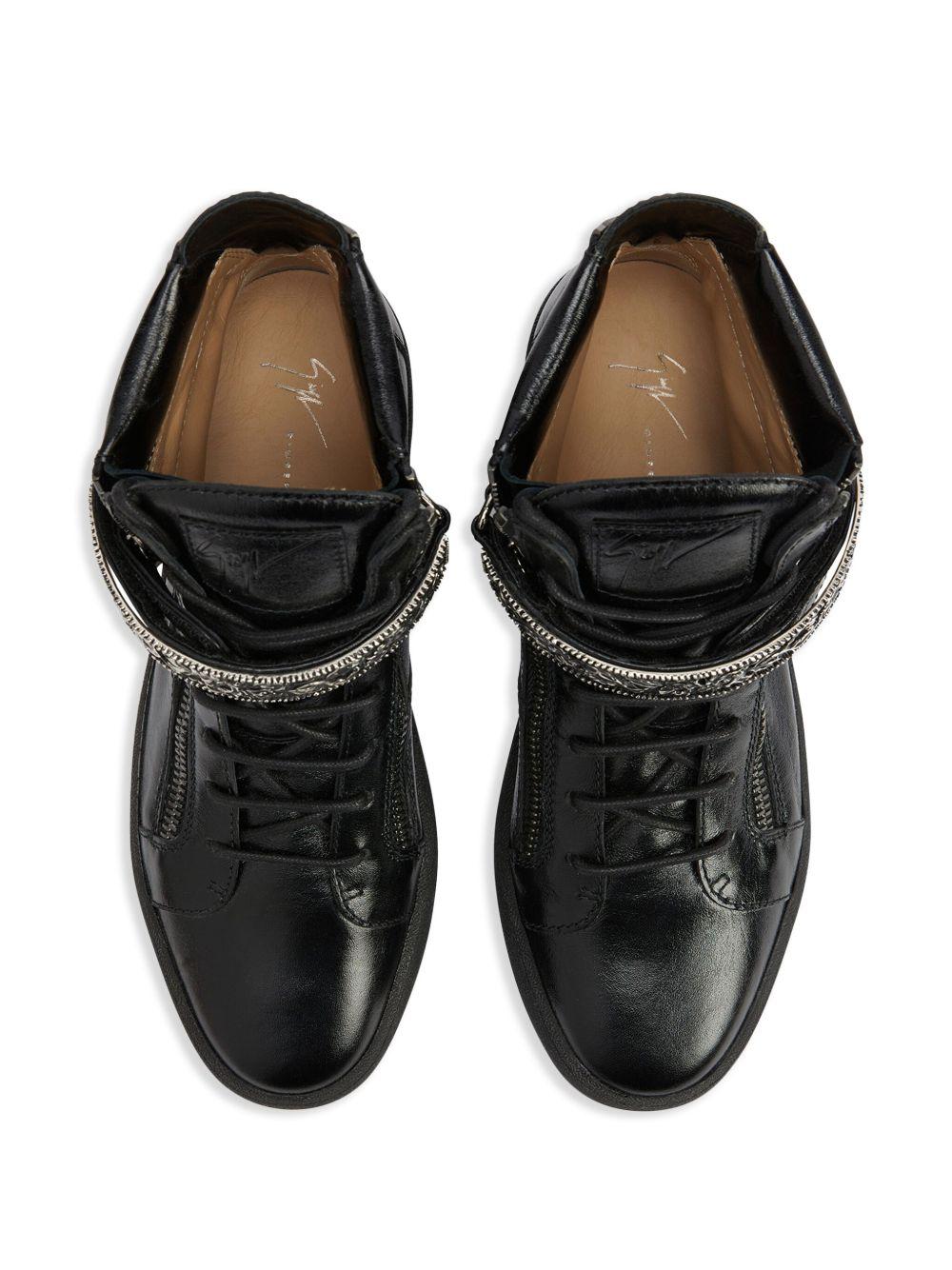 Giuseppe Zanotti Coby Deluxe leather single-strap mid-top sneakers | Black | black | calf leather | mixed-metal hardware | logo patch at the tongue | round toe | front lace-up fastening | rear zip fastening | branded insole | flat rubber sole | Leather/Rubber/Calf Leather | Hi-Tops | Sneakers | Shoes | Men