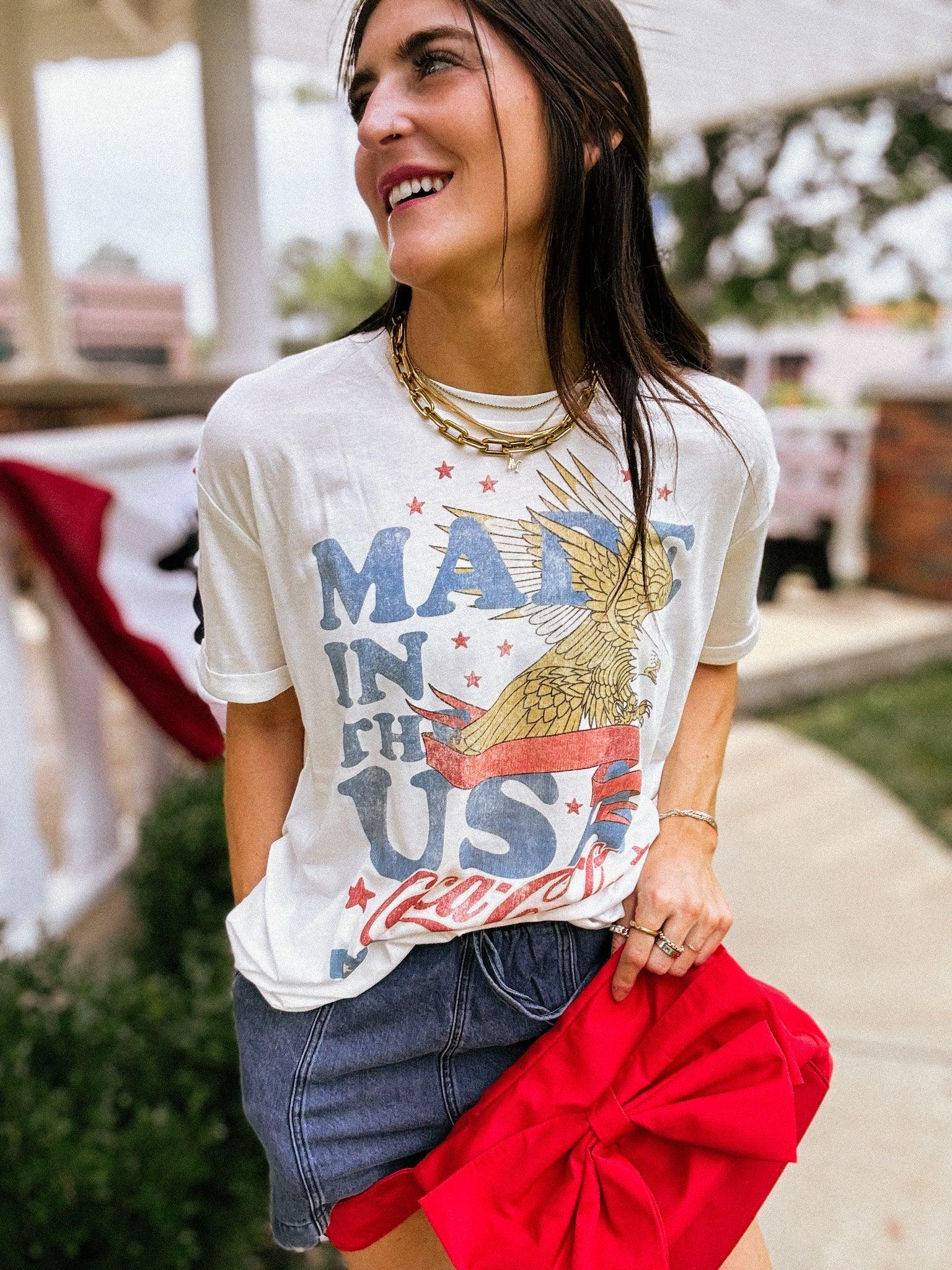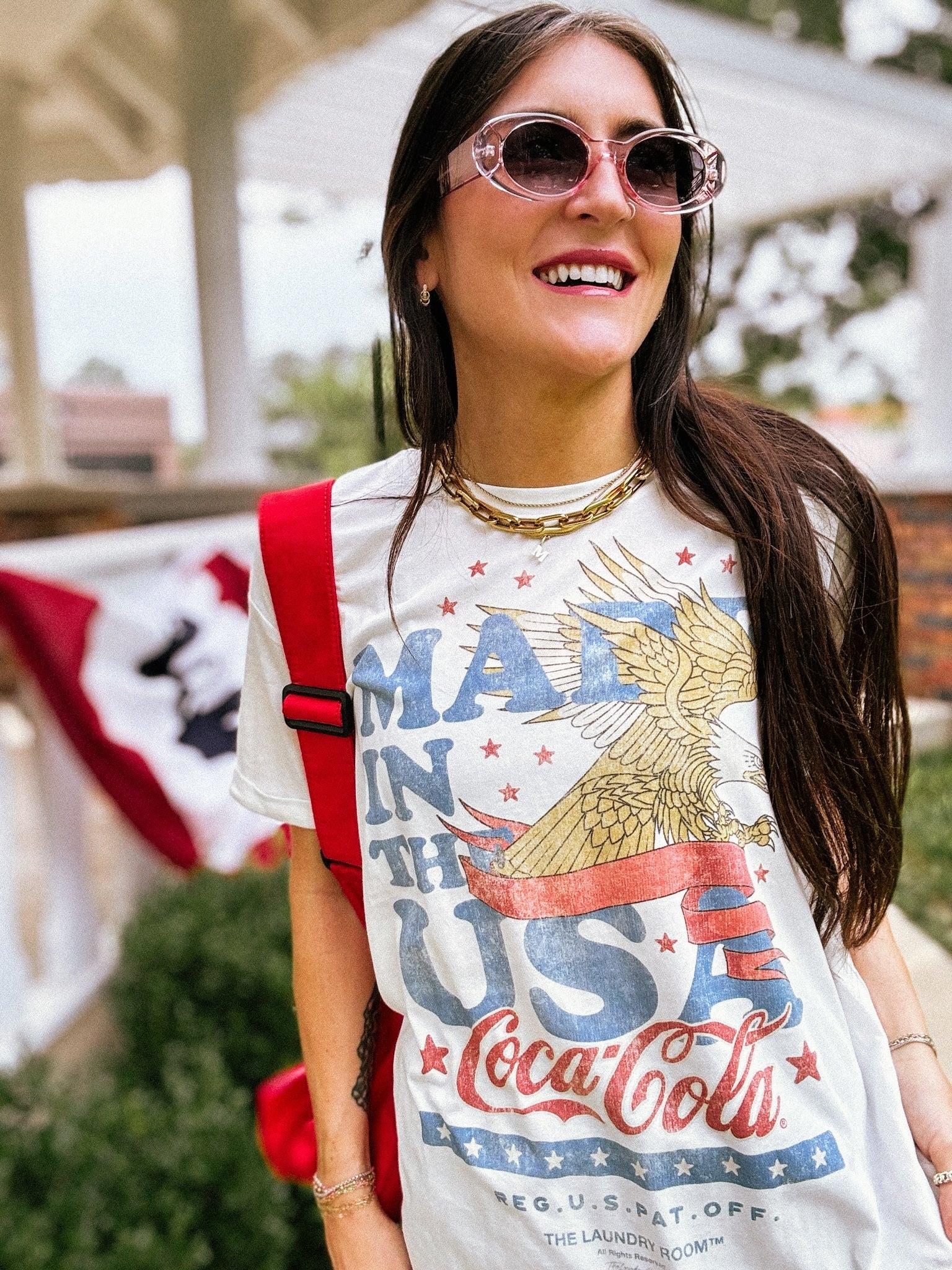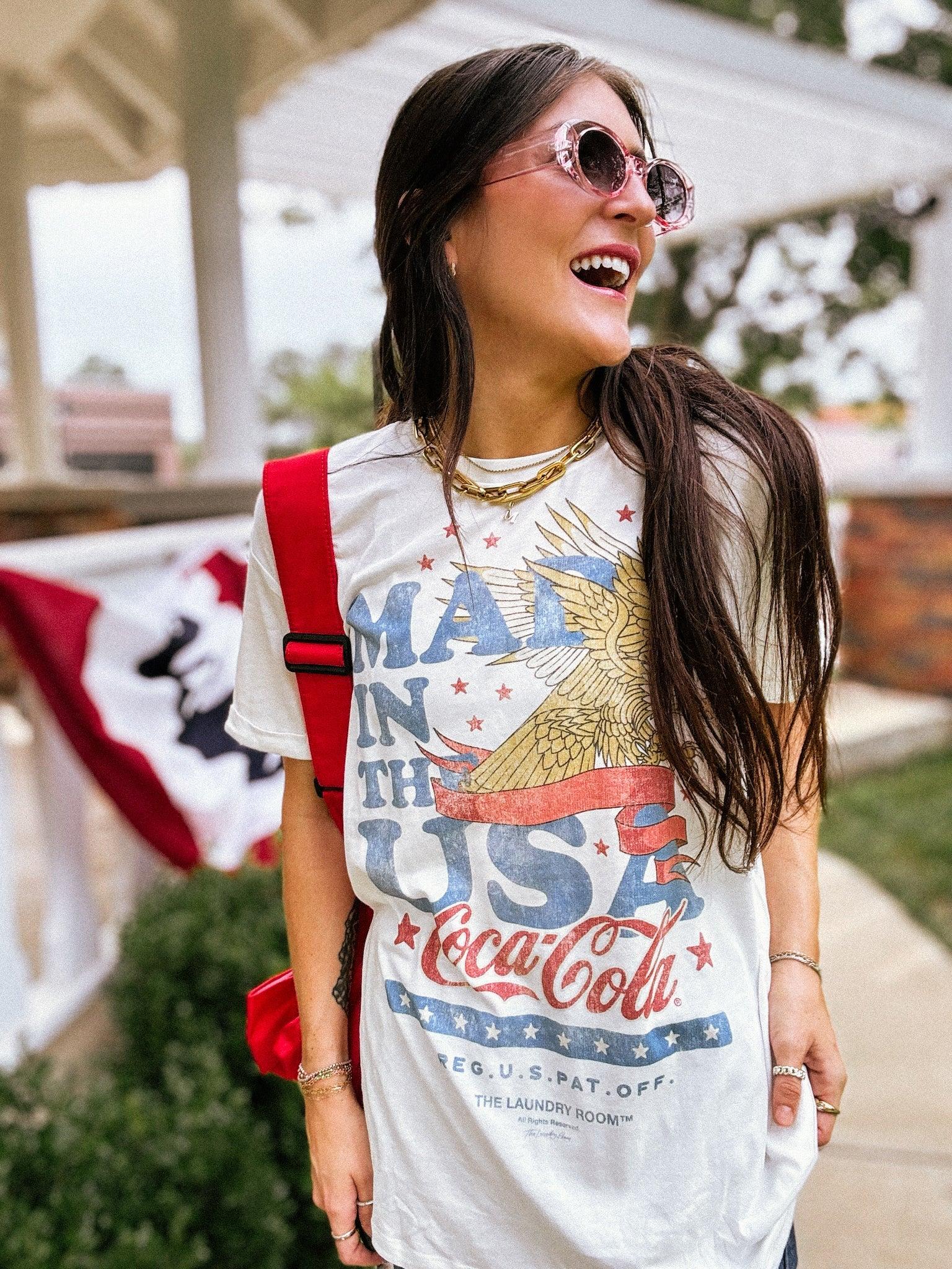 Celebrate classic Americana with the Laundry Room’s Coca Cola USA Banner Oversized Tee. This playful, roomy tee features a bold Coca Cola graphic that adds a fun, nostalgic vibe to your casual wardrobe. Perfect for relaxed days, its oversized fit ensures comfort while making a stylish statement.