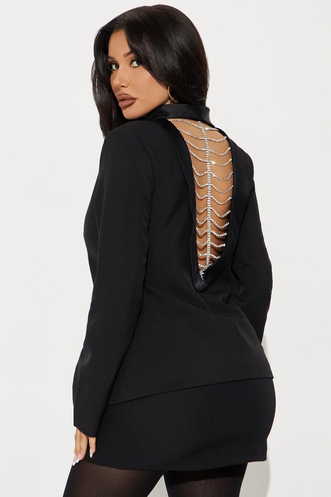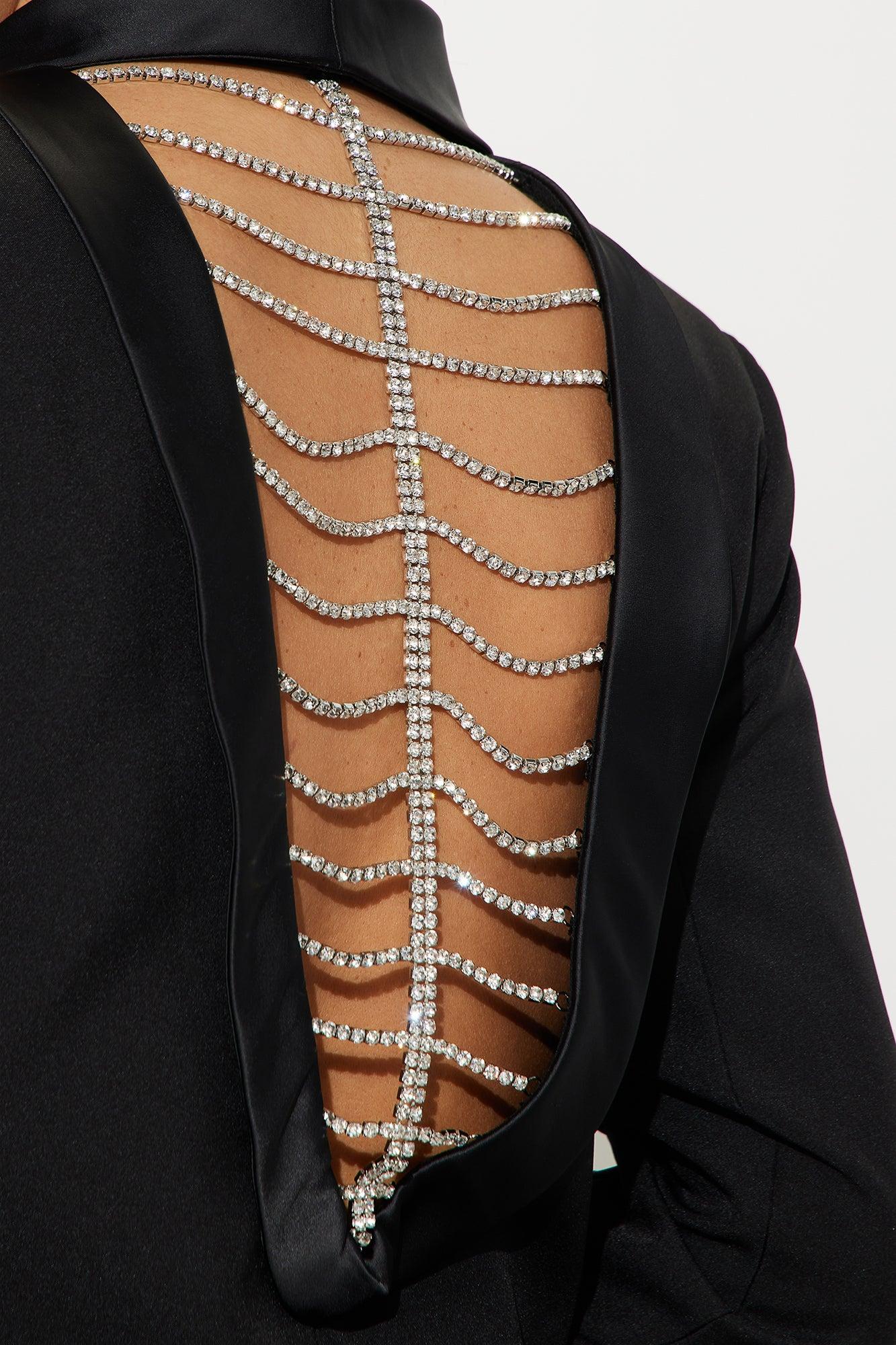Available In Black. Blazer Lapel Collar Long Sleeve Crepe Woven Rhinestone Detail Back Cut Out Detail Satin Trim Fully Lined Shell: 95% Polyester 5% Spandex Contrast: 90% Polyester 10% Spandex Lining: 100% Polyester Imported California Proposition 65WARNING: Cancer and Reproductive Harm - www.P65Warnings.ca.gov.