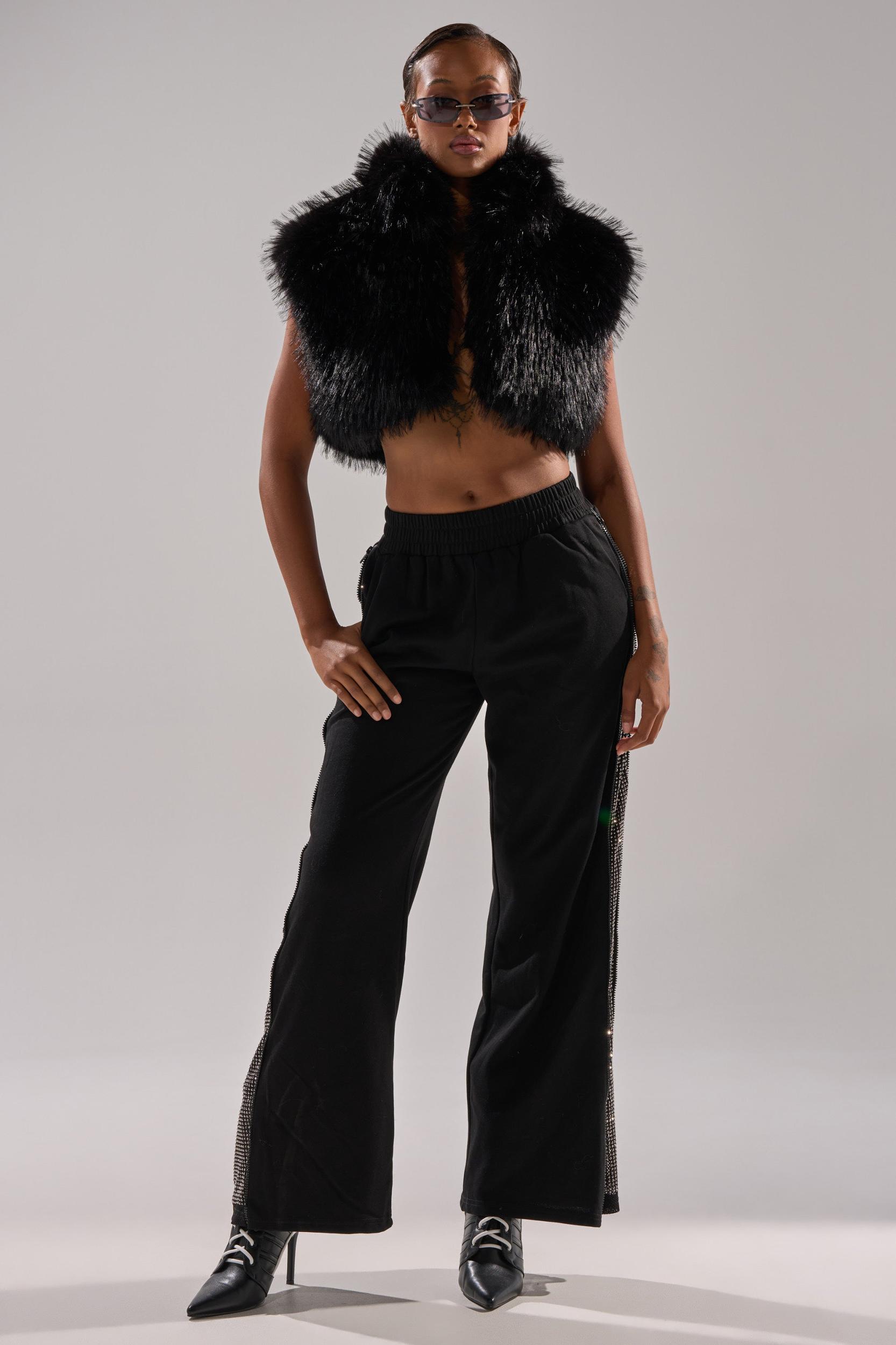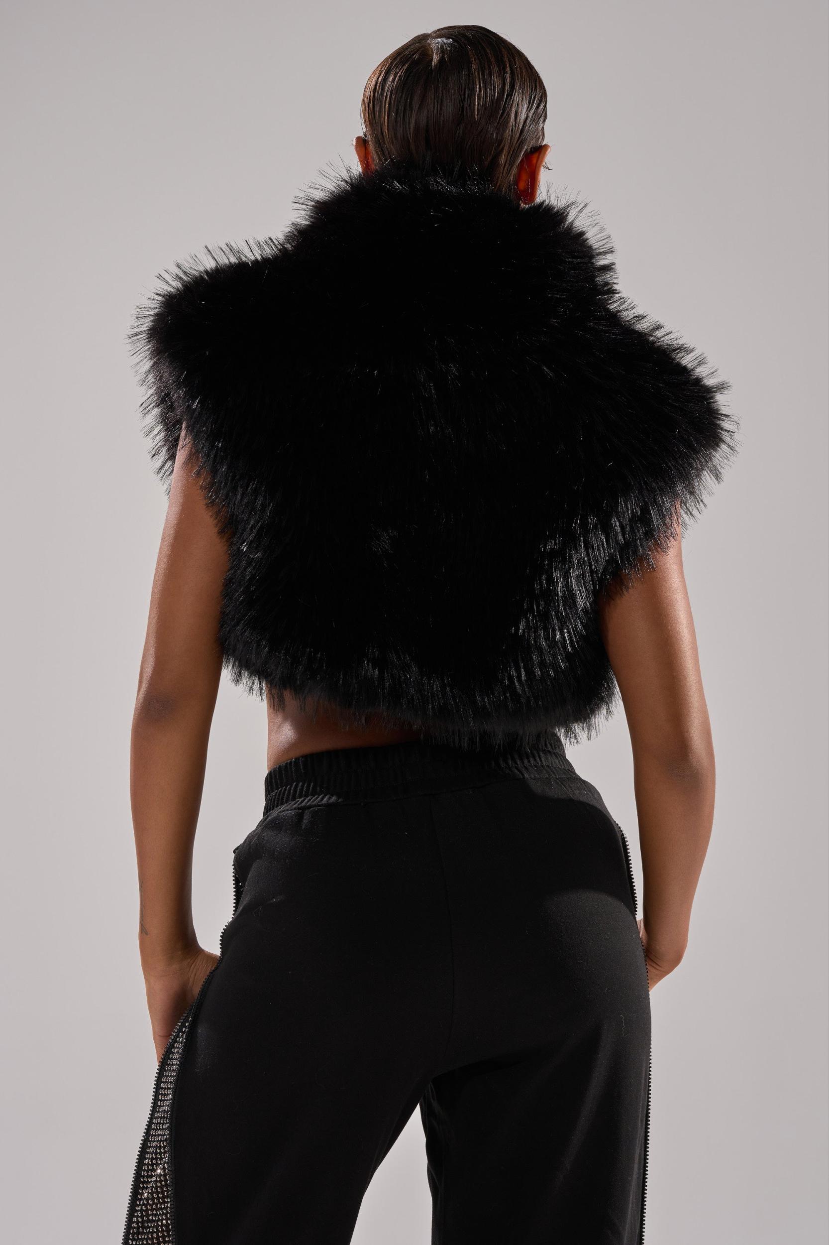 Fur that flirts. The AKIRA Label Coco Cropped Fur Vest In Black is made from cuddly faux fur and boasts a high collar, a sleeveless design, concealed hook-and-eye front closures, and a sleek inner lining. Complete with a boxy, cropped fit. - Fabric: 100% Polyester, Lining: 100% Polyester- No Stretch- Imported (all measurements approximate from small)- 15” Shoulder to Hem- 18” Shoulder to ShoulderProduct ID: 1060527 (all measurements approximate from 1X)- 17” Shoulder to Hem- 20” Shoulder to ShoulderProduct ID: 1060531
