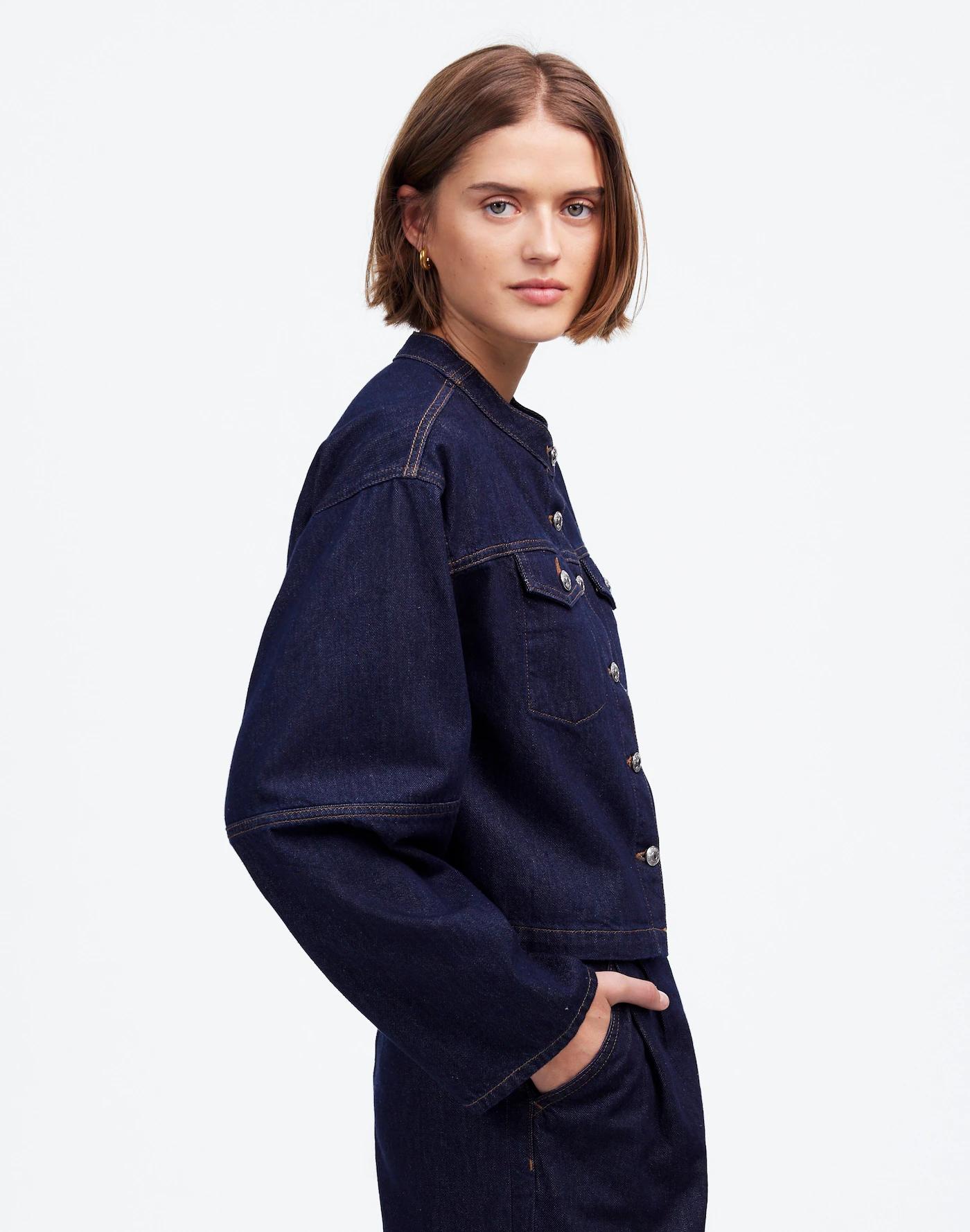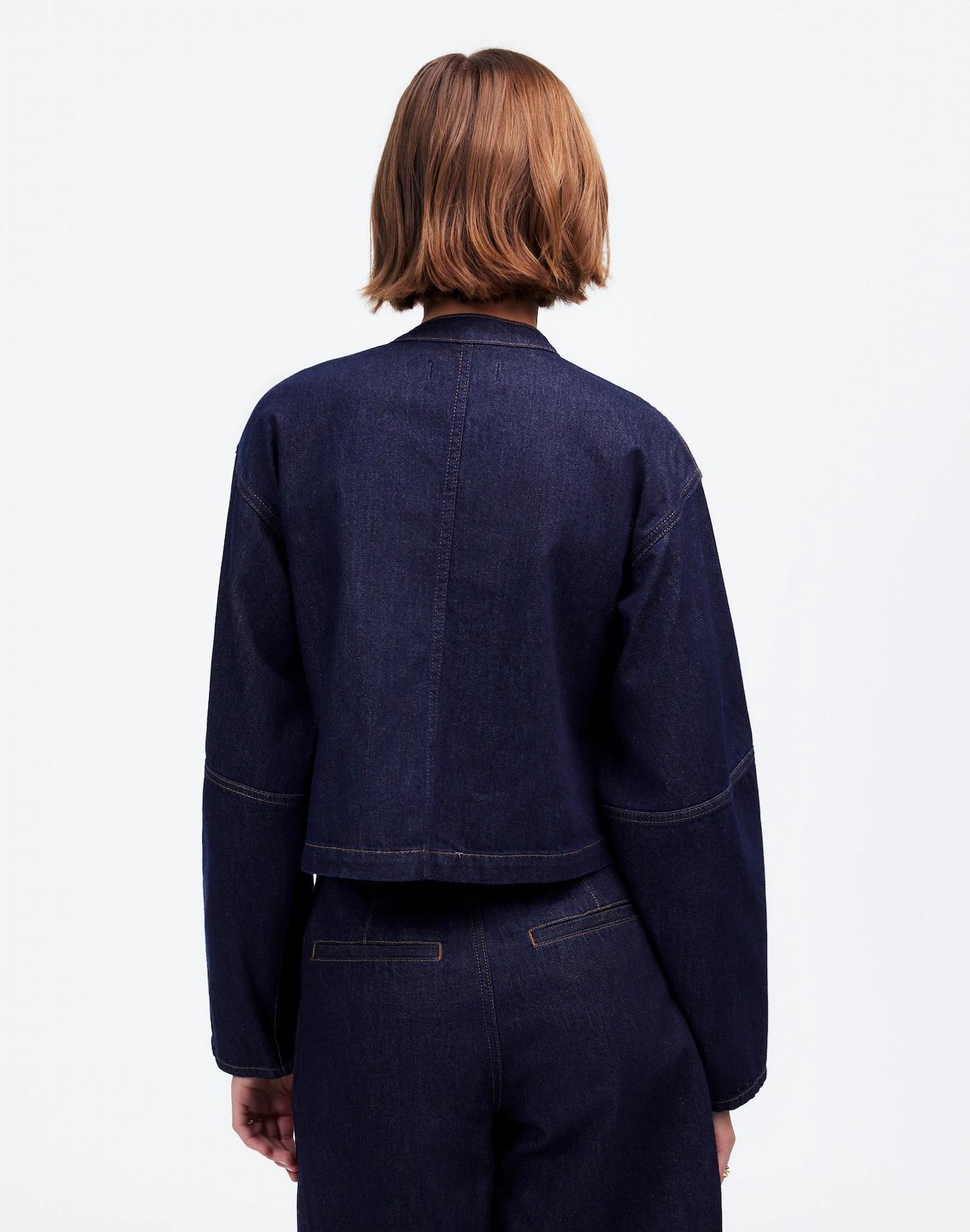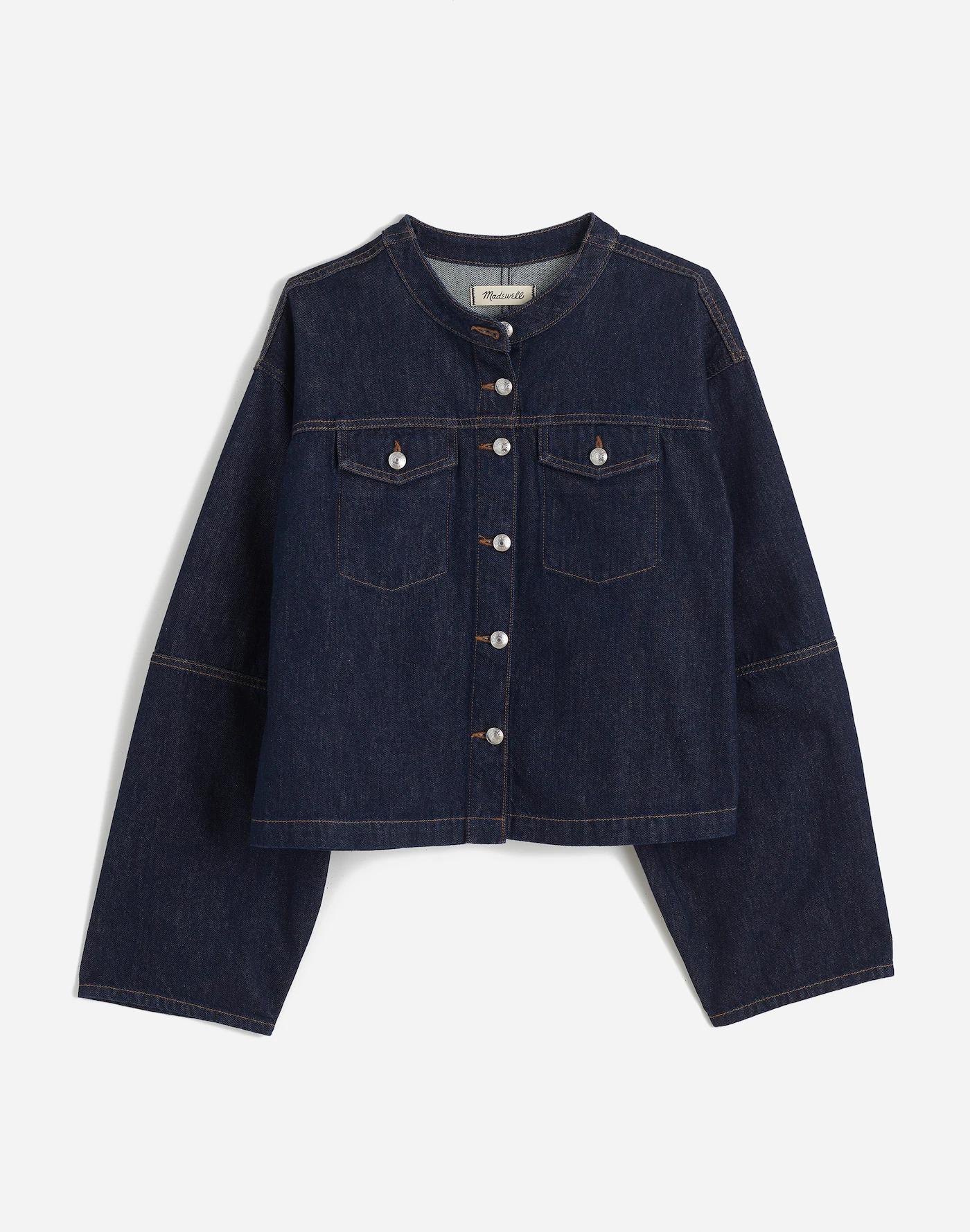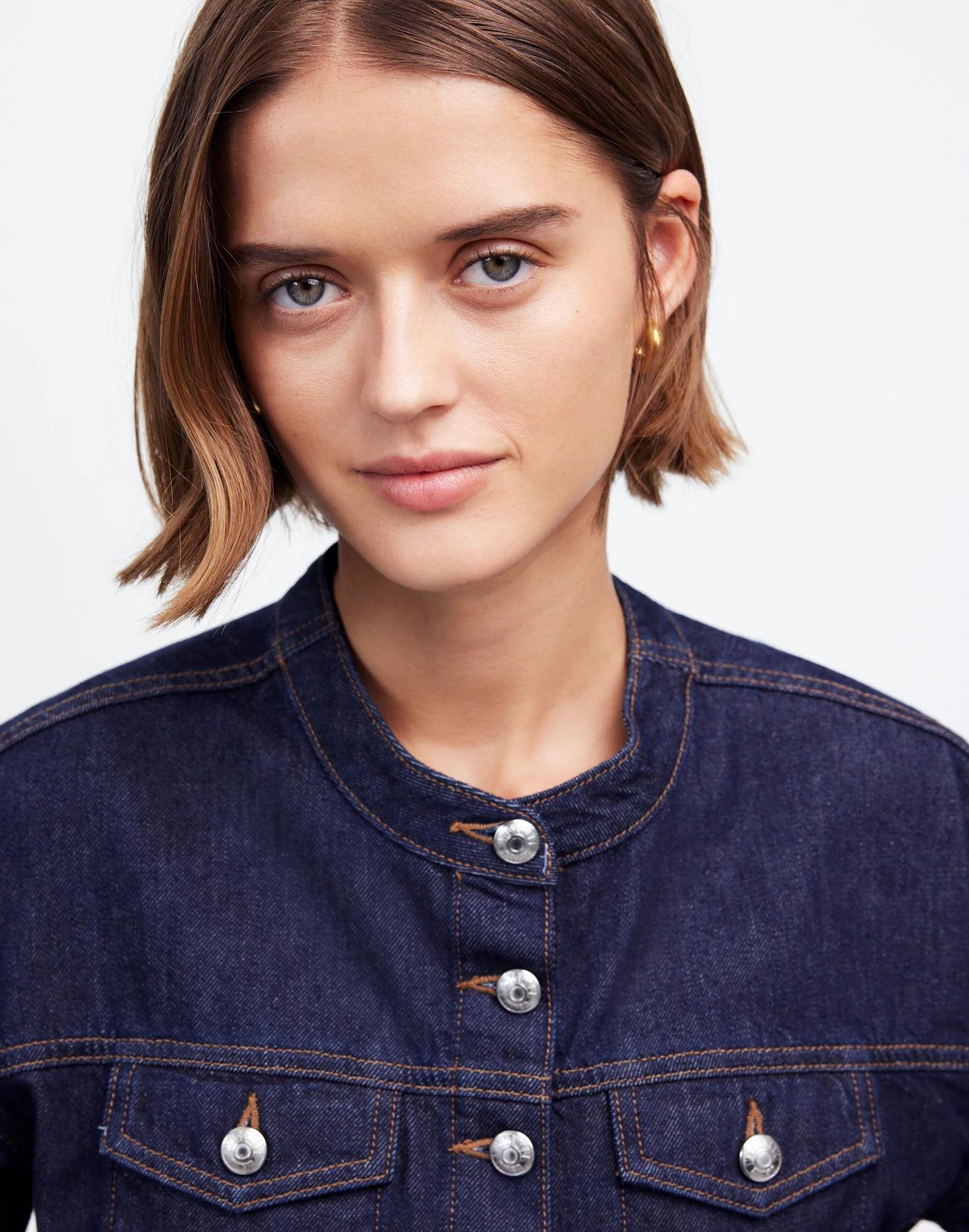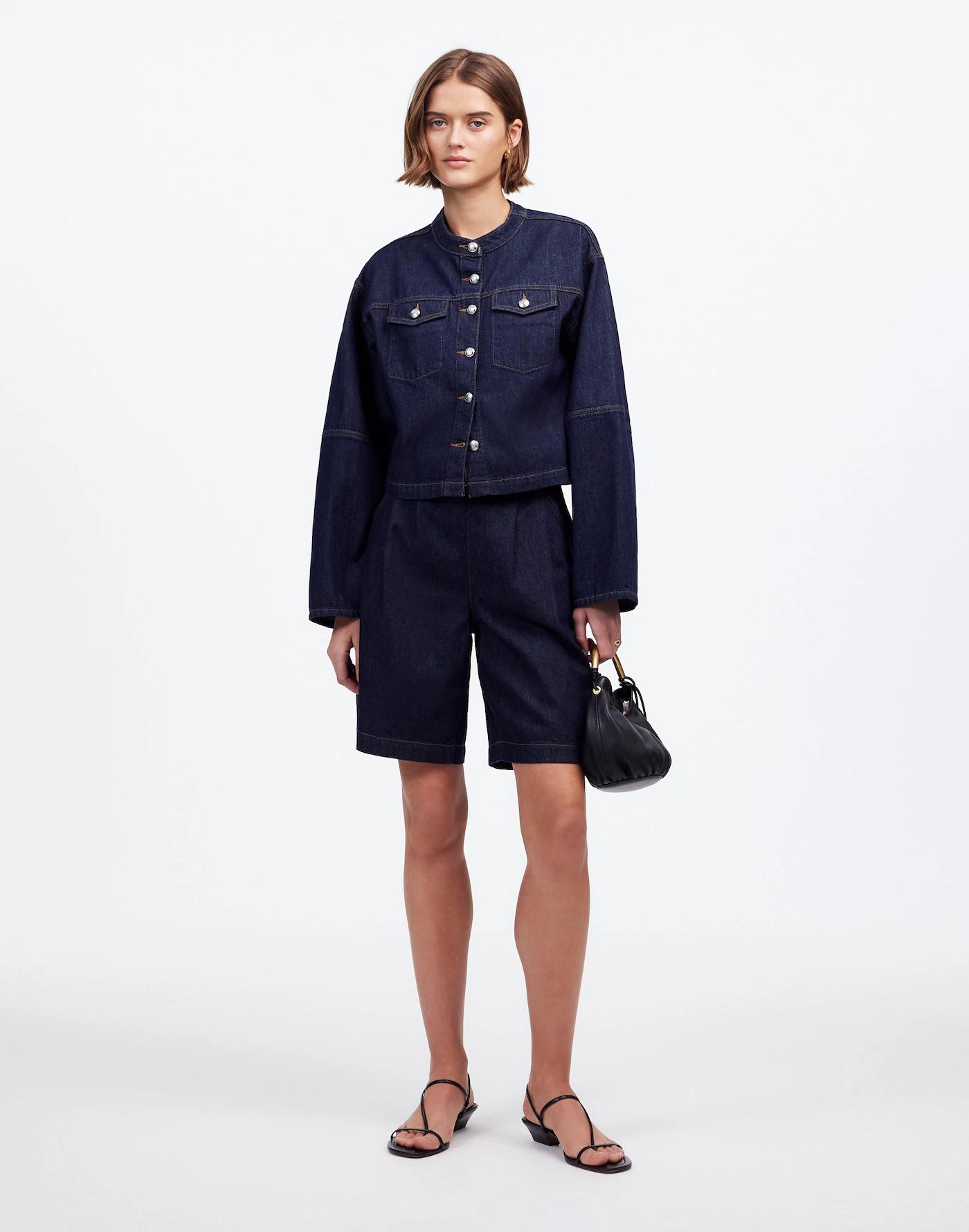 This denim jacket is elevated with details like a collarless design, cocoon sleeves and contrast gold topstitching. In Essex, our rich rinse wash with an elevated yet lived-in feel. Complete the look with our matching pleated skirt or shorts.