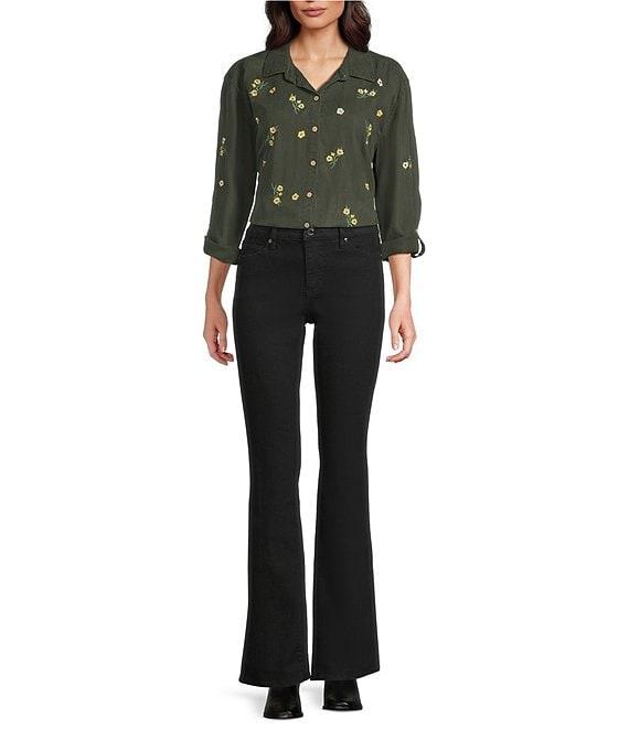 From Code Bleu, these jeans feature: Stretch denim fabrication High rise Boot-cut leg Belt loops 5-pocket style Clean hem Button/zip fly closure Approx. 32"inseam, 19" leg opening, front rise:10.5", back rise: 15.5" Cotton/recycled polyester/spandex Machine wash Imported.