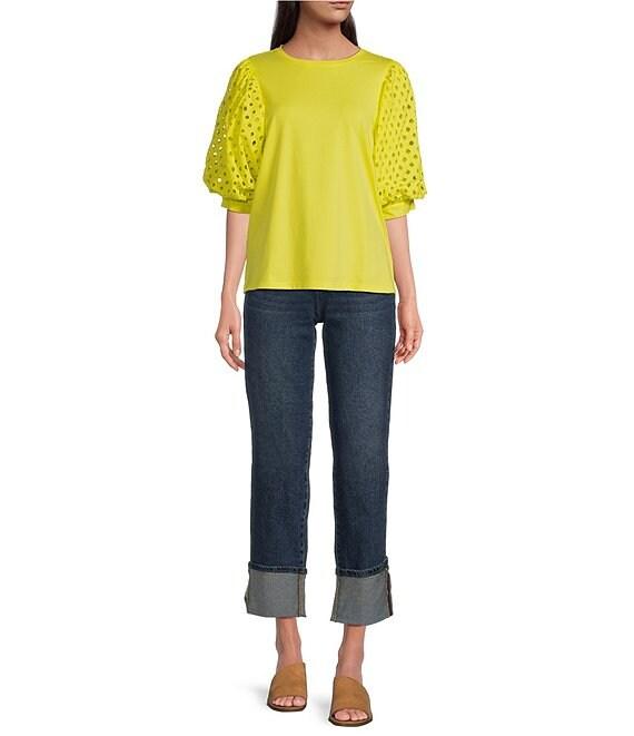 From Code Bleu, these jeans feature: Stretch denim fabrication High-rise Wide leg silhouette Belt loops Front and back patch pockets Straight hem Front button/zip closure Approx. 26" inseam, 16" leg opening, 11.75" front rise, 15.5" back rise Cotton/spandex Machine wash/tumble dry Imported.