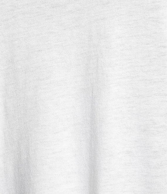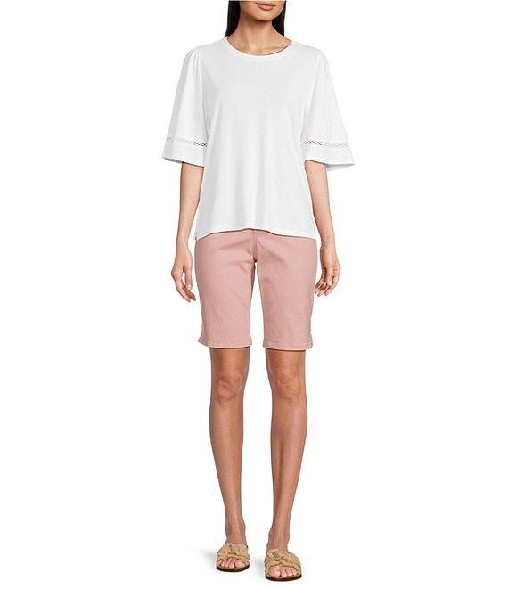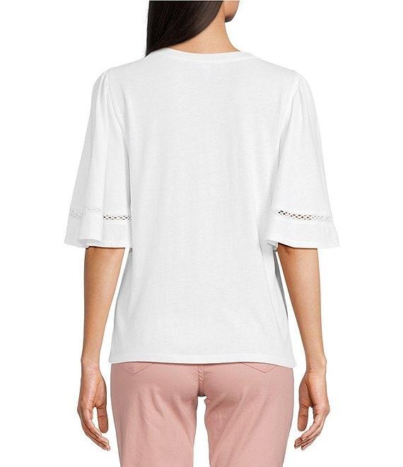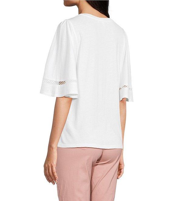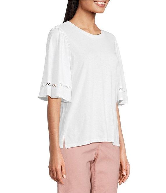 From Code Blue, this top features: Knit fabrication Crew neckline Short sleeves Crochet trim sleeve detail Shirring at sleeves Straight hem with side slits Pullover construction Approx. 24" length Cotton/modal Machine wash / tumble dry Imported.