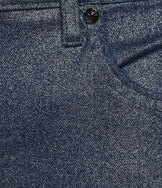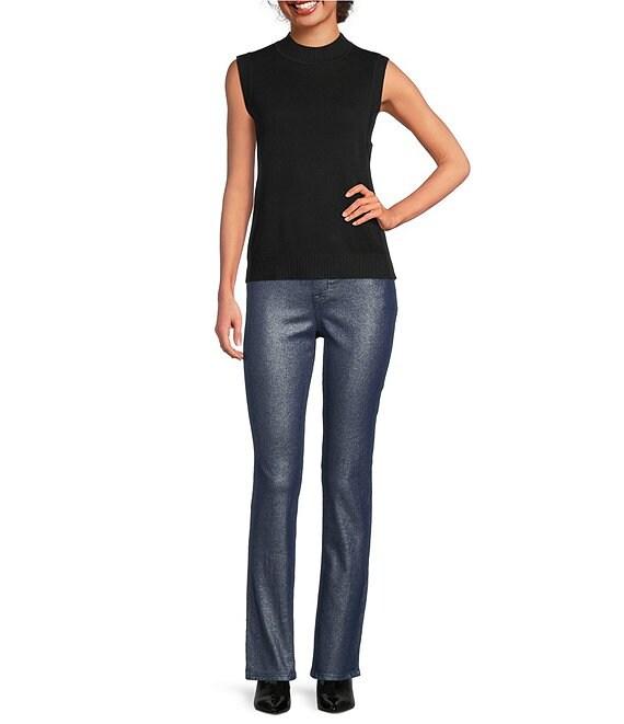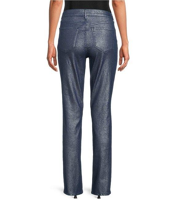 From Code Bleu, these jeans feature: Stretch foil coated denim fabrication Belt loops High rise 5 pocket styling Straight leg silhouette Ankle length Front button and zipper closure Approx. 32" inseam Machine washable Imported.