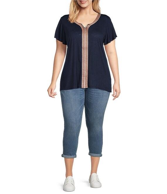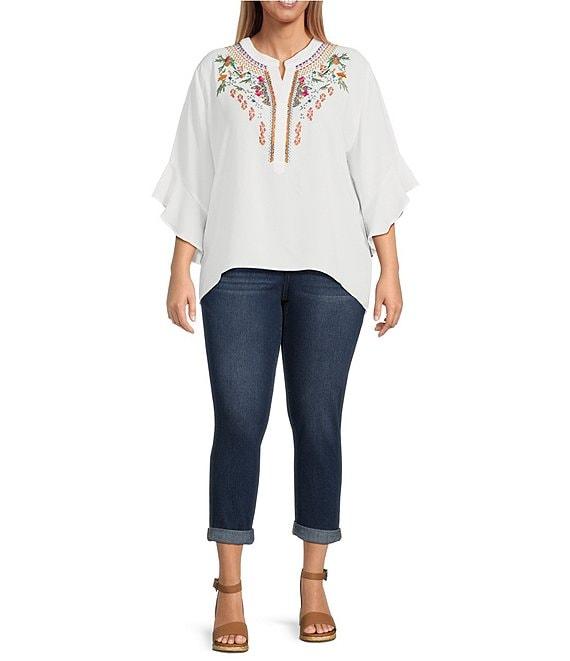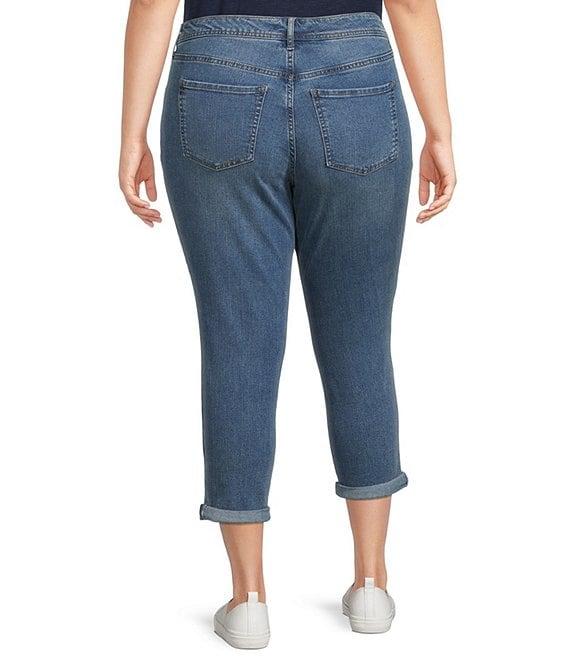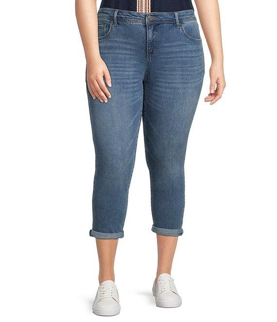 From Code Bleu Plus, these jeans feature: Denim fabrication Belt loops 5-pocket style Rolled cuff hemline Button and zip fly closure Approx. 27" unrolled inseam; 25" rolled inseam; 15" leg opening; 11.5" front rise; 18.5" back rise Cotton/repreve polyester; viscose/elastane Machine wash Imported.