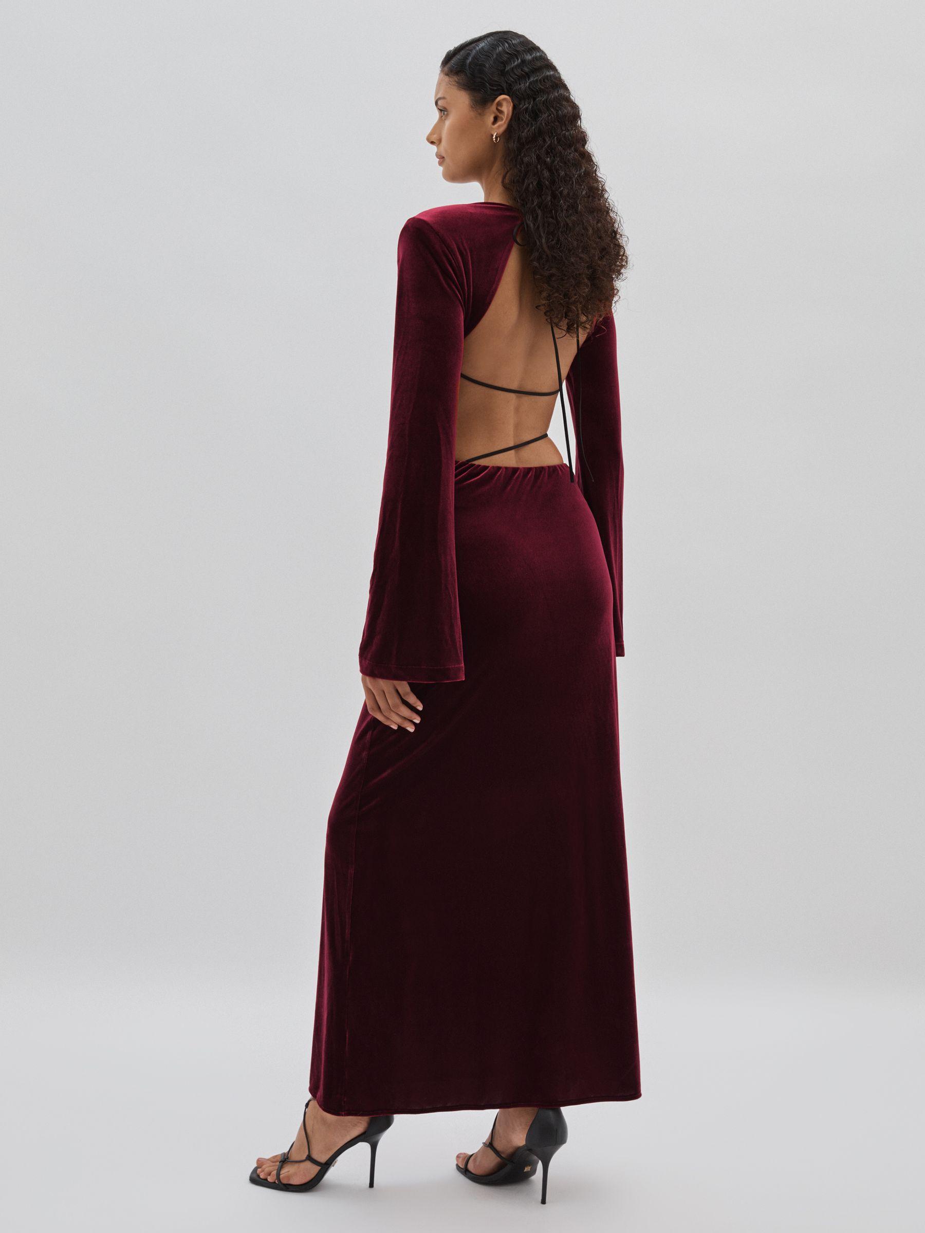 Opt for high-octane sophistication with the Scandale dress. It’s crafted from plush jewel-toned velvet with an open back that’s crossed with slender straps, then accented with padded shoulders, fluted sleeves and a floor-grazing hem. Mid-weight velvet. Round neck. Fluted sleeves. Floor-length hem. Open back. Rouleau nape ties.