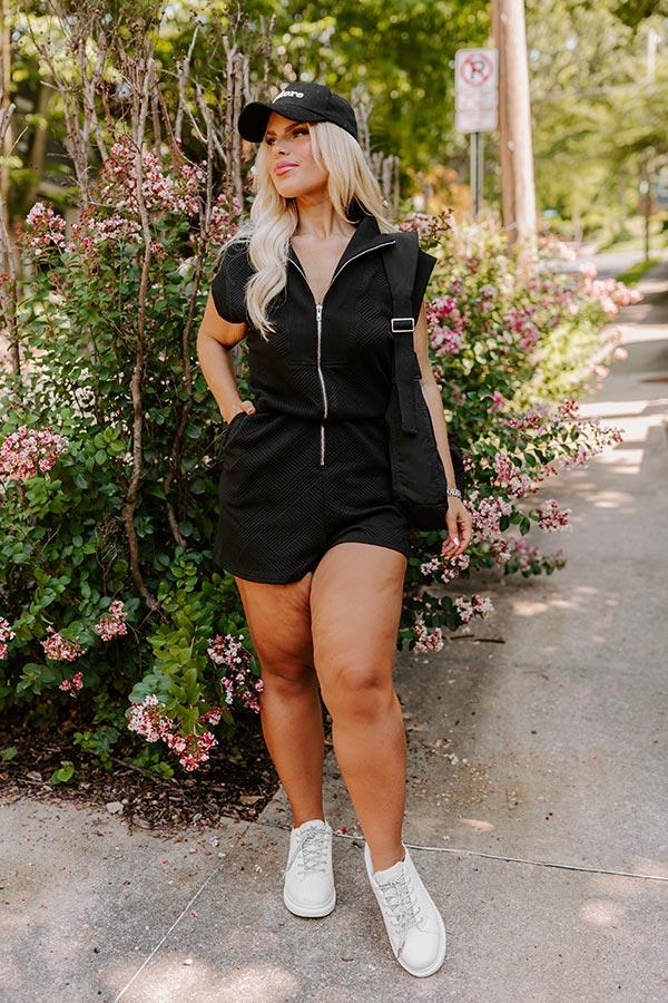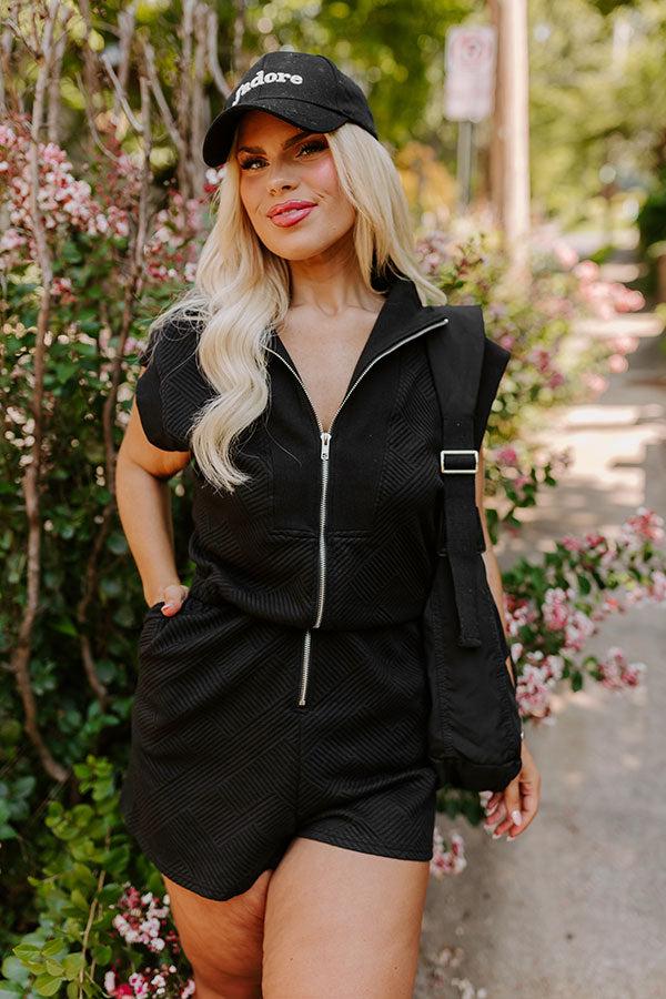 - This chic romper combines modern elegance with playful sophistication. Its trendy textured fabric adds depth and style while the zippered front gives it a sleek look. Perfect for making a fashion-forward statement, this romper is a must-have for any stylish wardrobe. - Unlined material with a trendy texture - A v-cut collared neckline - A zip down front that ends just below the waistline - A sleeveless cut with a ribbed texture - An elastic waistband - Functional side pockets - A relaxed yet flattering silhouette that ends in straight upper-thigh length hemlines