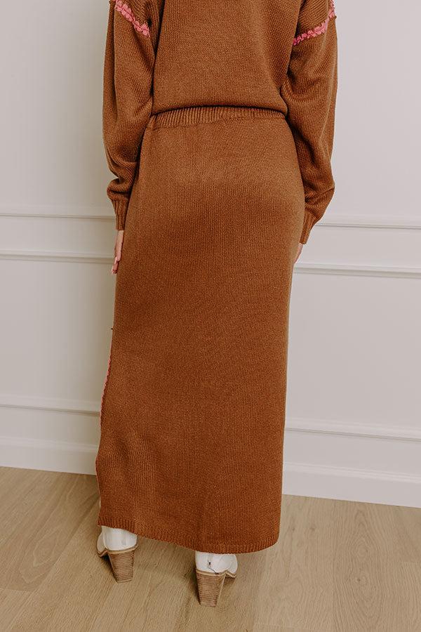 - Embrace the season's sweetest vibes with a look that's all about relaxed charm and effortless appeal. Perfect for bringing a playful touch to your wardrobe, this knit skirt radiates cozy cuteness with its delicate embroidered accents, making it a must-have for chilly days. Add a dose of casual flair to your collection and stay stylish through every crisp breeze. - Unlined knit material - An elastic waistband - Pink embroidery down each side - A relaxed silhouette that ends in a straight hemline with a ribbed texture and an accent slit on one side
