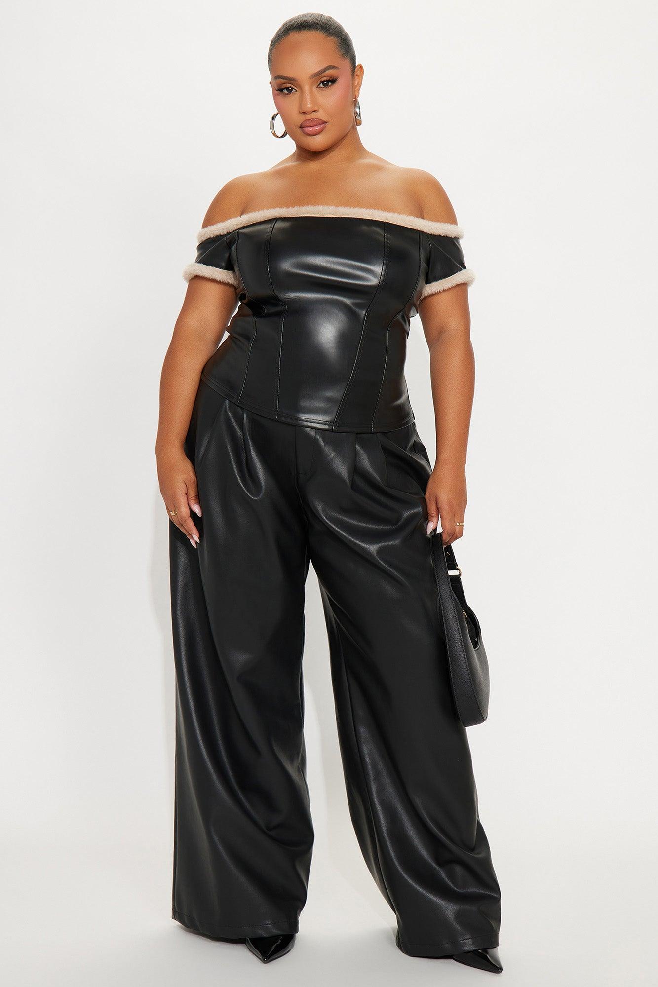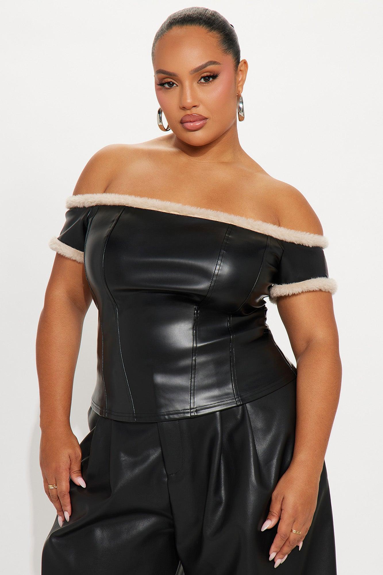 Available In Black/combo. Faux Leather Top Off Shoulder Short Sleeve Fur Trim Back Zipper Closure Backless Stretch Self: 55% Polyester 45% Polyurethane Faux Fur: 100% Polyester Lining: 90% Polyester 10% Spandex Imported California Proposition 65WARNING: Cancer and Reproductive Harm - www.P65Warnings.ca.gov.