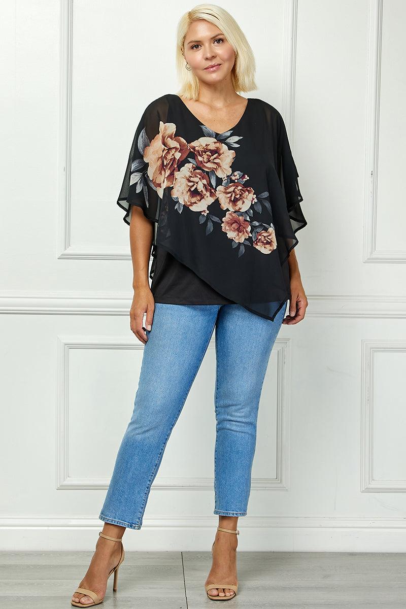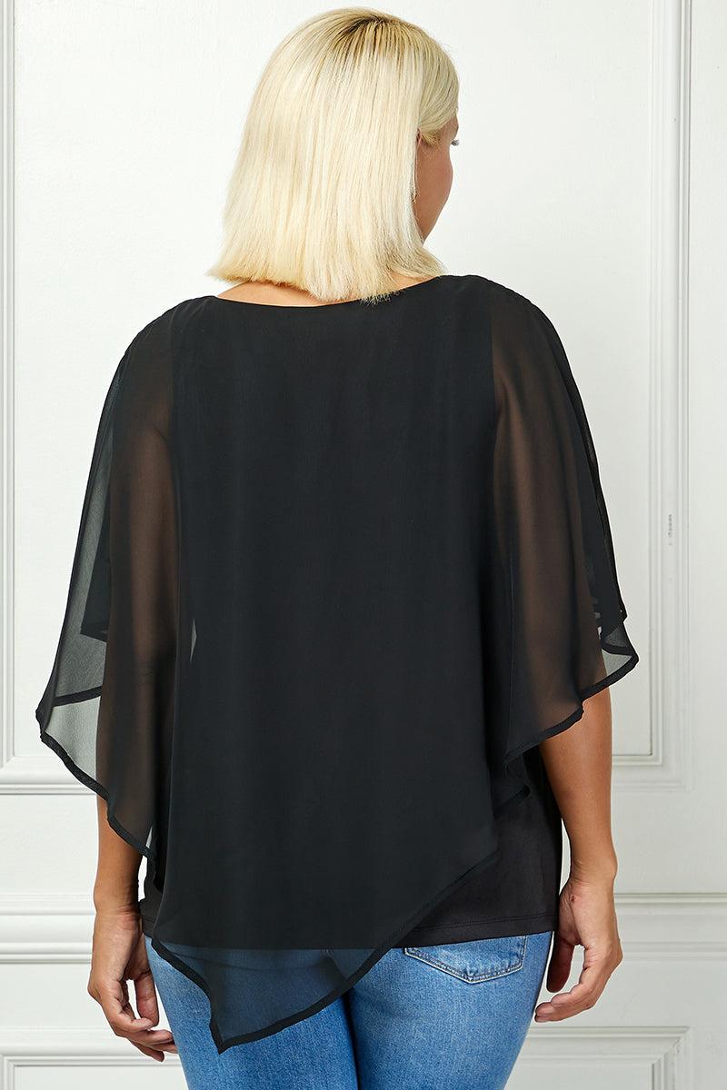 Elegant and effortlessly flowing, this blouse offers a flattering layered design that brings both comfort and sophistication. The poncho-style overlay drapes beautifully over an attached tank, creating graceful movement with every step. Cold shoulder cutouts add a modern, feminine edge, while the tie-accented sleeves provide a soft and stylish finish. The V-neckline frames the face and elongates the silhouette, making this piece perfect for both day and evening wear. Pair it with tailored pants or jeans for a polished, versatile look.