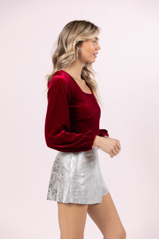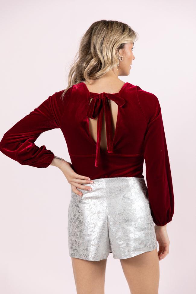 Details Burgundy, Velvet, Open-Back Bodysuit Fabric has stretch Button snap bodysuit, elastic cuffs, tie back detail, open back Pair this with a cute faux leather skort/skirt! Lined Size small from shoulder to hem: 24" Material and Care 95% Polyester, 5% Spandex Wash on cold separately, hang dry Patterns may vary Materials may have natural variations Colors may vary from different viewing devices
