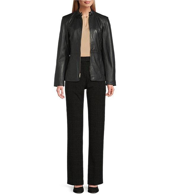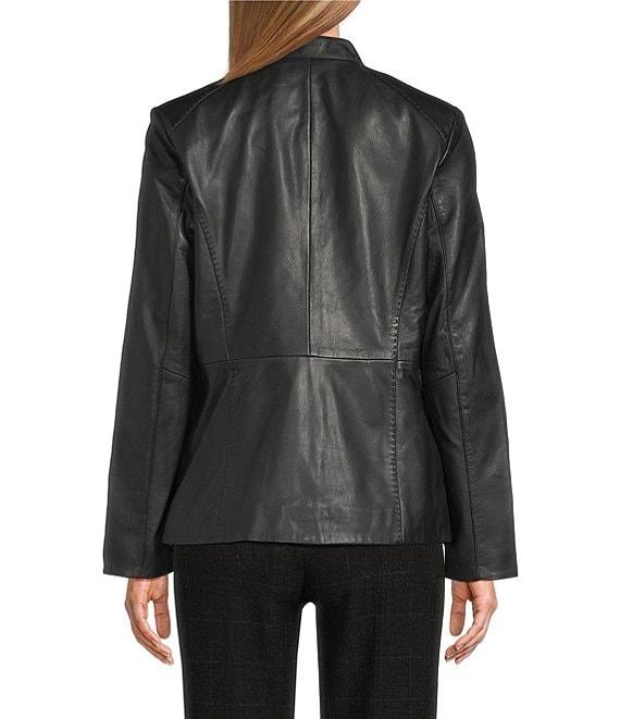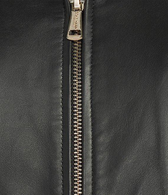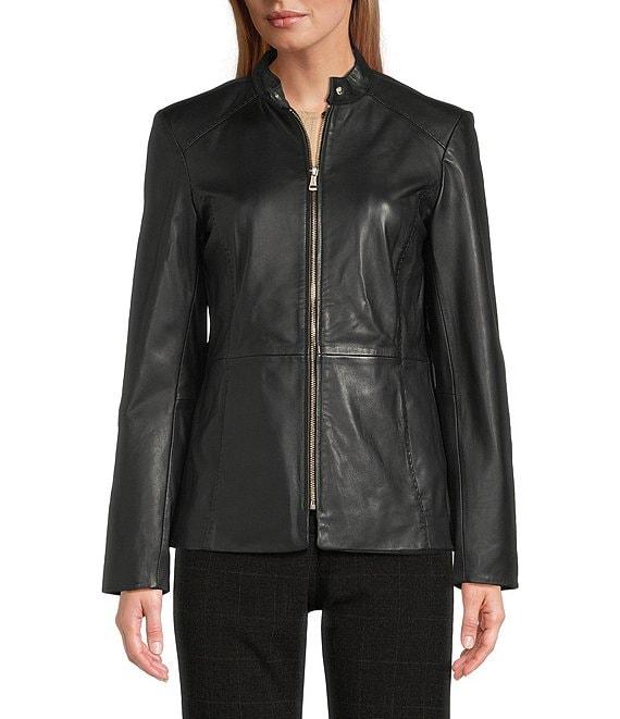 From Cole Haan, this jacket features: Leather fabrication Stand collar neckline Long sleeves Side seam pockets Hand stitched detail Standard fit Fully lined Straight hemline Zip front closure Approx. 25" length Leather; lining: polyester Professionally by a leather expert Imported.