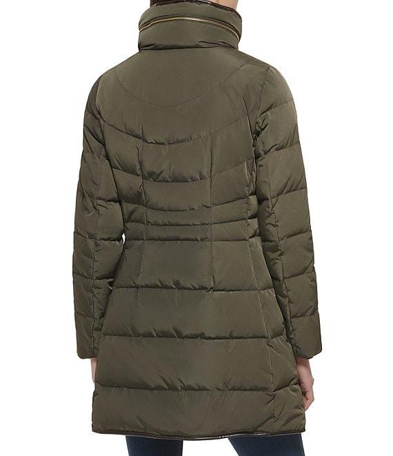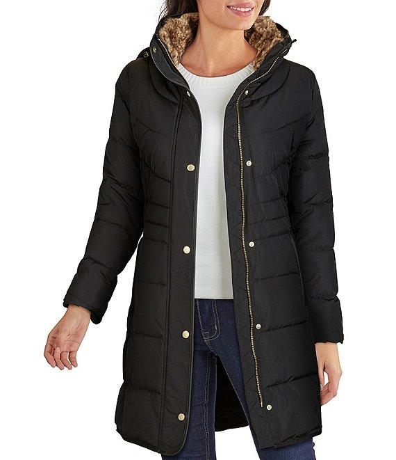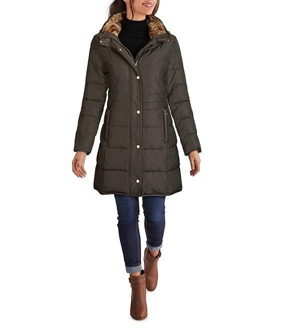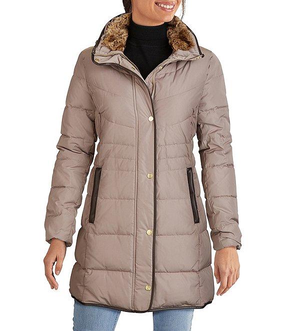 From Cole Haan Signature, this coat features: down fabrication Single breasted puffer silhouette Faux fur lined stand collar with hood Long sleeves Front welt zip pockets trim detail Lined Straight hemline Front snap with hidden zip closure Approx. 33" length Polyester Dry clean Imported.