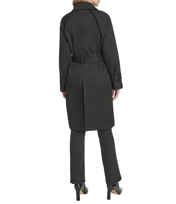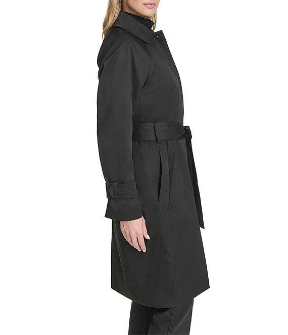 From Cole Haan, this coat features: Insulated raglan twill fabrication Trench coat silhouette Shirt collar neckline Long sleeves with belt cuffs Welt pockets Self tie belt Faux leather detail Water resistant Regular fit Fully lined Straight hemline Button front closure Approx. 40" length Polyester/polyurethane Machine wash Imported.