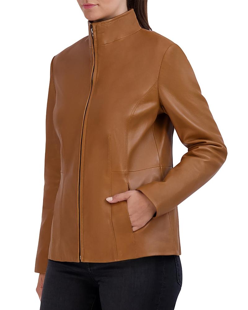 From Cole Haan, this jacket features:Single breasted silhouettePoint collar necklineLong sleevesFunctional inseam pocketsMid weightLinedStraight hemlineFront zip closureApprox. 24 in lengthLambskin leather; lining: polyesterClean by a leather or suede expertImported.