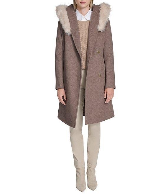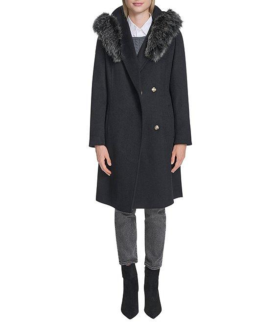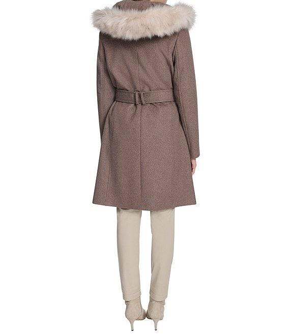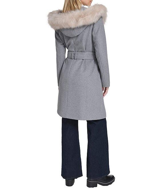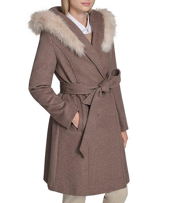 From Cole Haan, this coat features: Wool blend fabrication Wrap silhouette Removable faux fur trim Shawl collar neckline Long sleeves Welt pockets Self tie belt Water resistant Fully lined Straight hemline Snap front closure Approx. 37" length Wool/polyester blend Dry clean Imported.