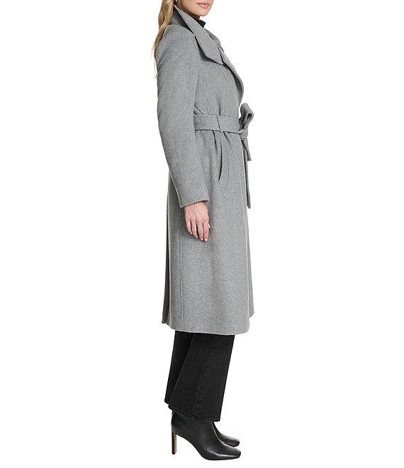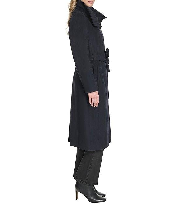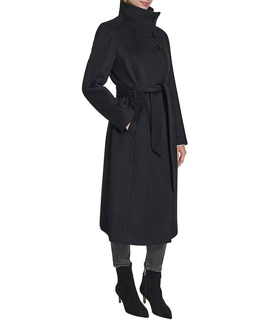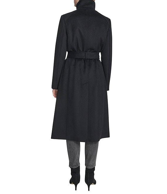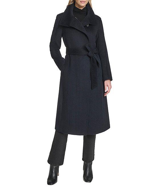 From Cole Haan, this coat features: Wool blend fabrication Wrap silhouette Stand collar Long sleeves Welt pockets Self tie belts Water resistant Self pipping detail Heavyweight Regular fit Fully lined Straight hemline Zip front closure Approx. 45.5" length Wool/polyester blend Dry clean Imported.