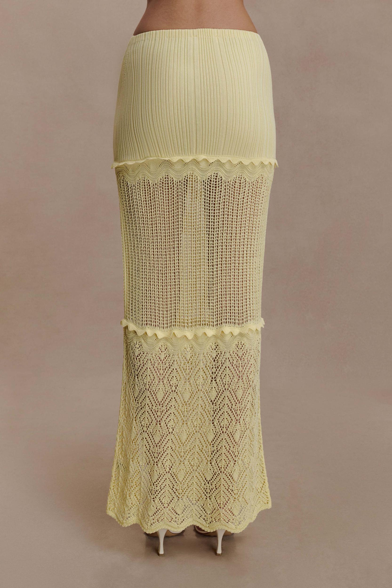 Delicate texture, effortless flow. The COLEENE Pointelle Knit Maxi Skirt brings soft femininity to a streamlined silhouette. Designed with a high-waisted, elasticated waistband, it offers a comfortable yet flattering fit that elongates the frame. Intricate pointelle knit detailing is finished with scalloped edges for a romantic touch, while the leg split adds movement and subtle allure. Unlined for a lightweight, breathable feel, this maxi-length skirt is an elevated knit essential — perfect for warm-weather styling or layered looks.