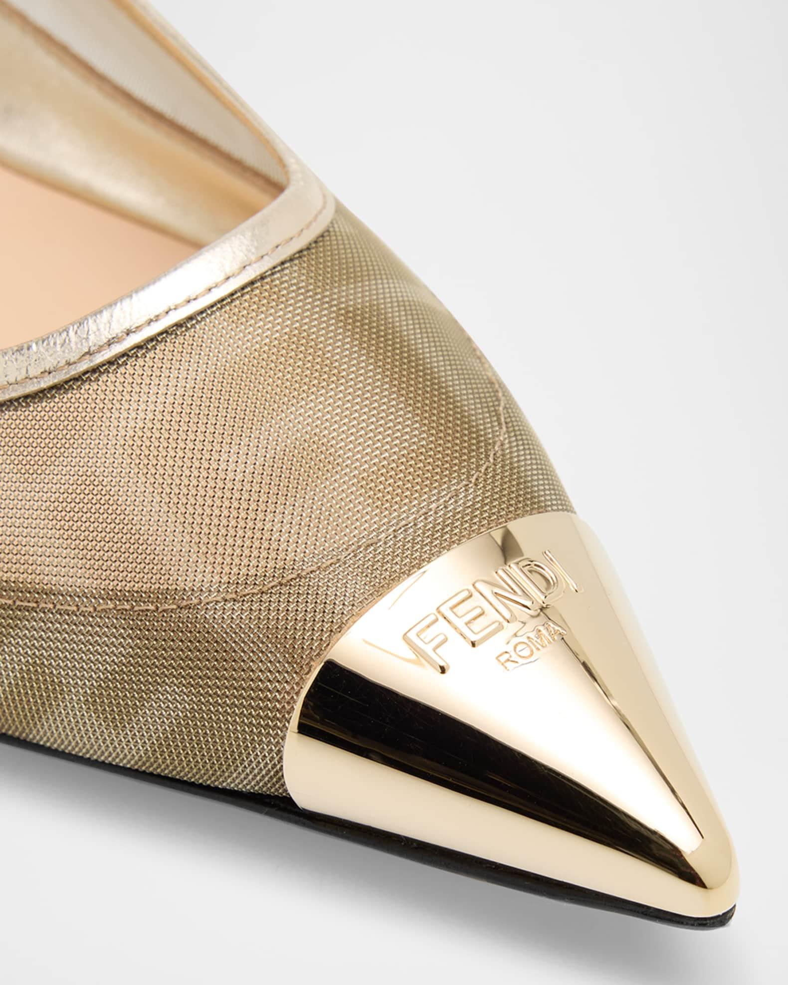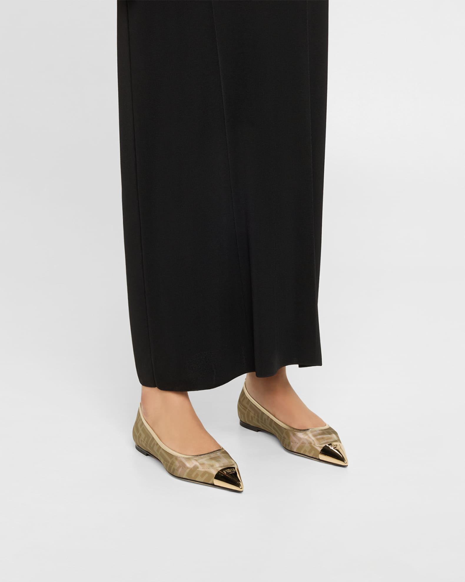 Fendi "Colibri" FF-printed mesh polyester ballerina flats with metallic leather trim. 0.17 in / 5 mm flat heel. Pointed, logo-engraved metal-cap toe. Slip-on style. Leather outsole. Lining: Leather. Professional cleaning recommended, spot clean. Made in Italy.