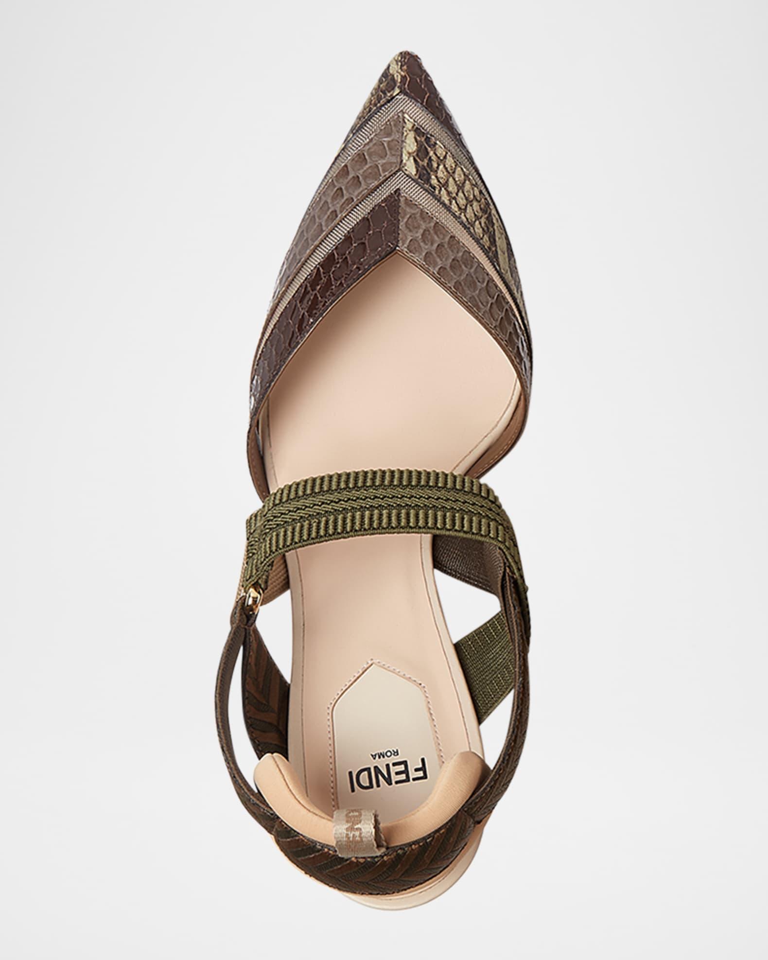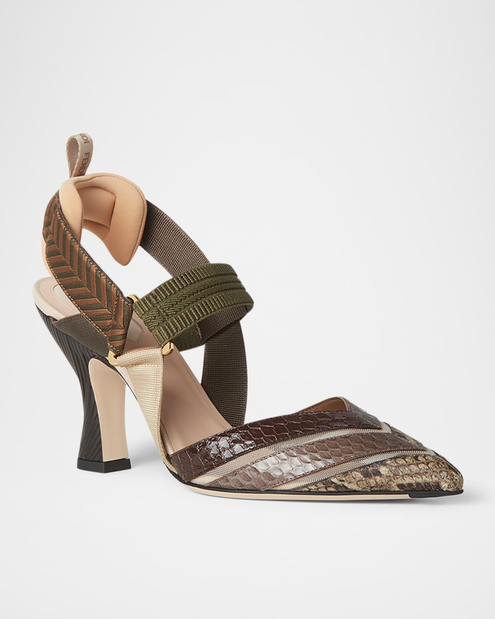Fendi "Colibri" mixed-media pumps feature mesh and ayers leather inlay with elastic ribbons that wrap around the foot 2.25 in / 55 mm handwoven rattan covered kitten heel Pointed toe Slingback strap Padded back of heel with tab Leather outsole with rubber inserts Professional cleaning recommended, spot clean Made in Italy
