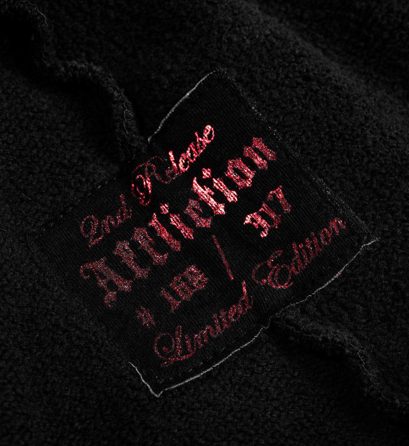 Collapse Pull Over Hood 100% Cotton Black Lava Wash No Drawstring Grinding On Sleeves & Bottom Hem Black Raw Edge Jersey Patch Each Piece is Uniquely Numbered Limited Edition