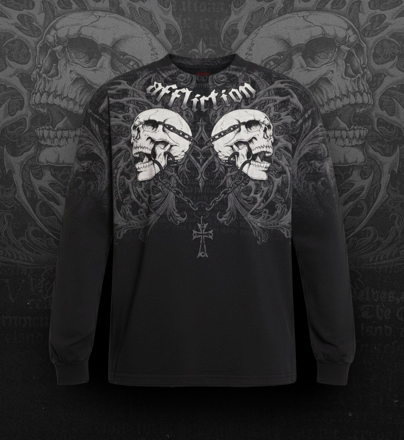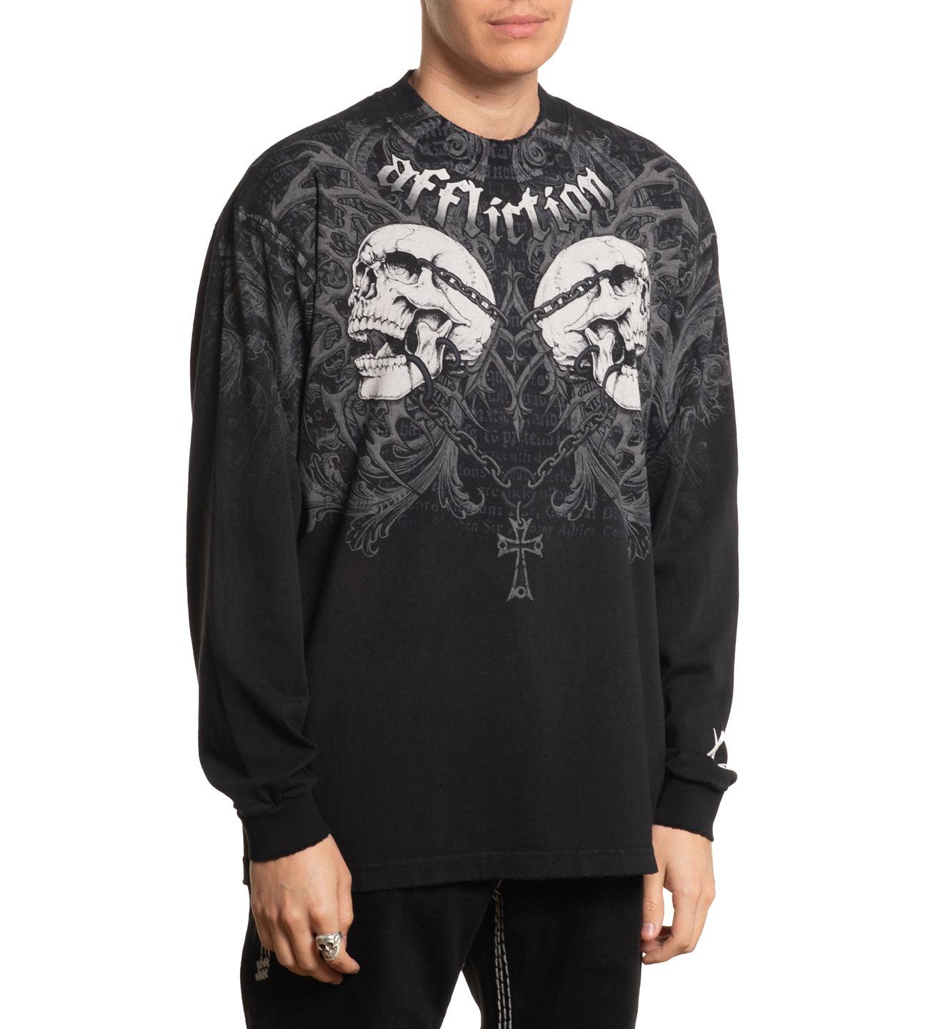 Affliction Mens Collapse Long Sleeve Mock Neck Black Reactive with Potassium Spray on Top Enzyme Silicone Wash After Print Grinding on Collar, Bottom Hem & Sleeves Black Raw edge jersey patch with zigzag stitch Red Foil Hangtag, internal label, neck print Model is wearing size L